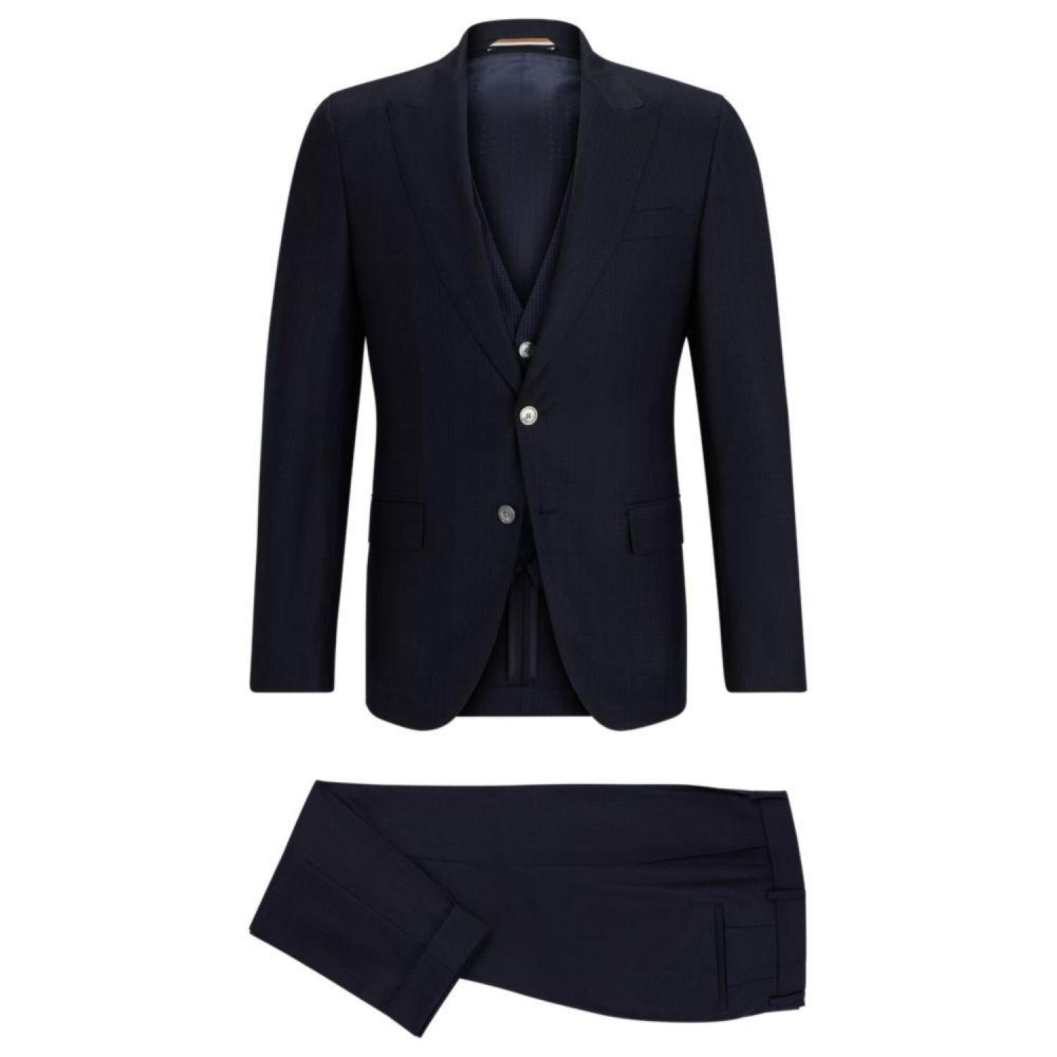 • A three-piece suit by BOSS Menswear, comprising a single-breasted jacket, double-breasted waistcoat and trousers.Woven with a plain check for classic style, this refined suit is crafted in rich virgin wool for a distinctive look. The waistcoat, also made from pure virgin wool, is presented in a differently patterned fabric for subtle contrast.The slim fit ensures a clean silhouette.