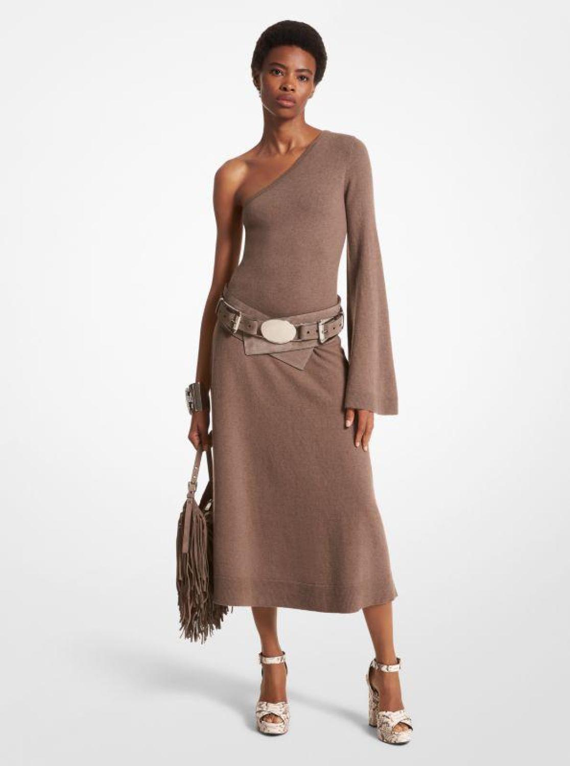 • This sleek and sophisticated dress will serve you well for so many occasions. Spun from stretch cashmere with a soft yet smooth hand, it’s designed in a one-shoulder silhouette that fits closely at the bodice before descending to a midi length. Style yours with everything from platform heels to ankle boots, depending on the dress code.
