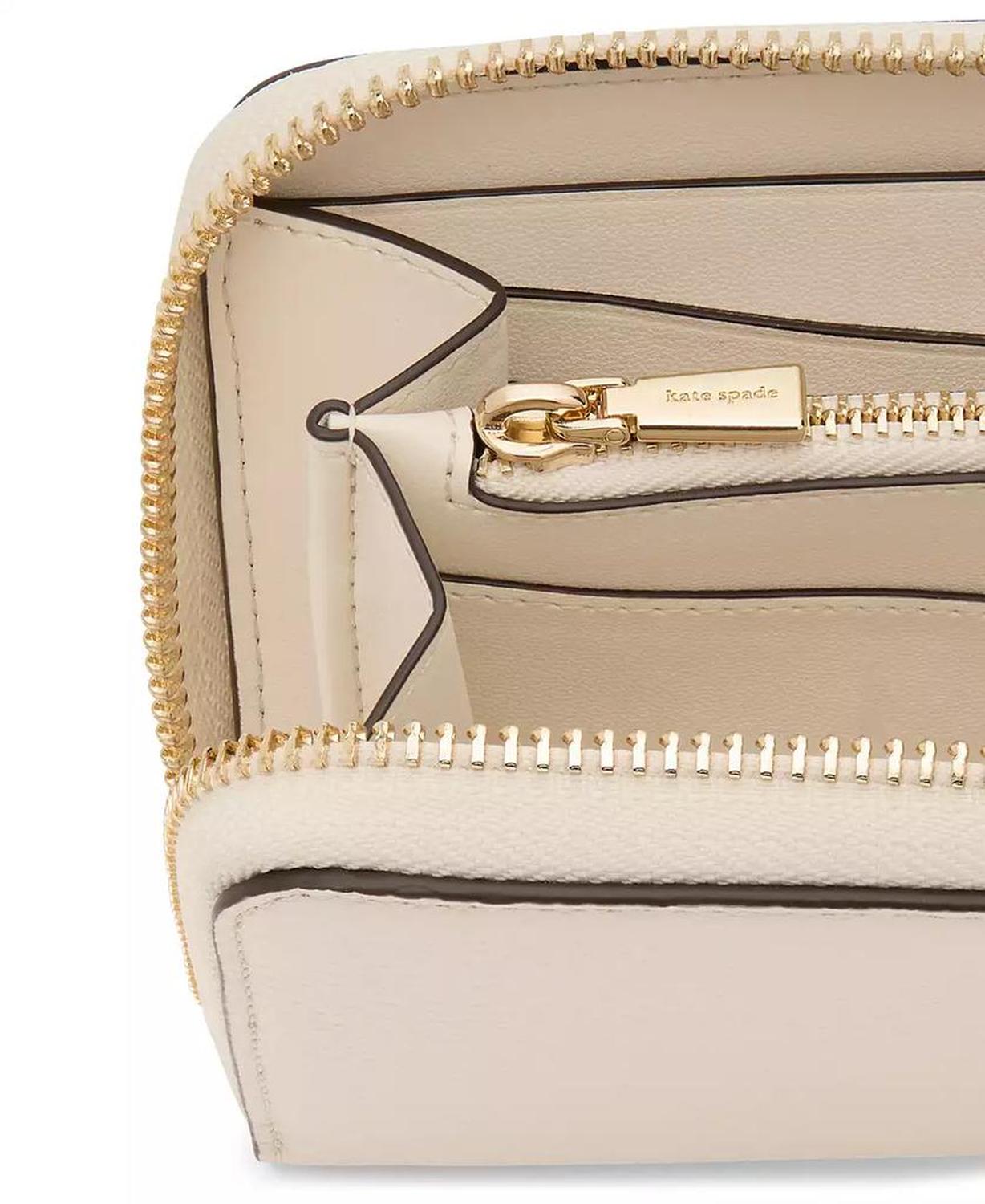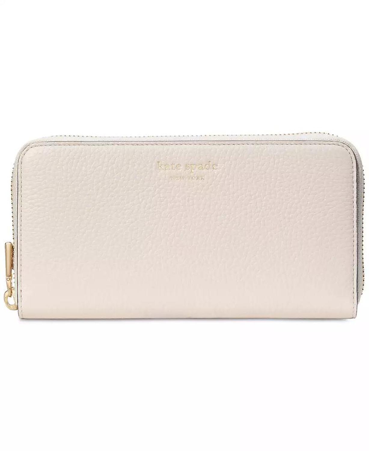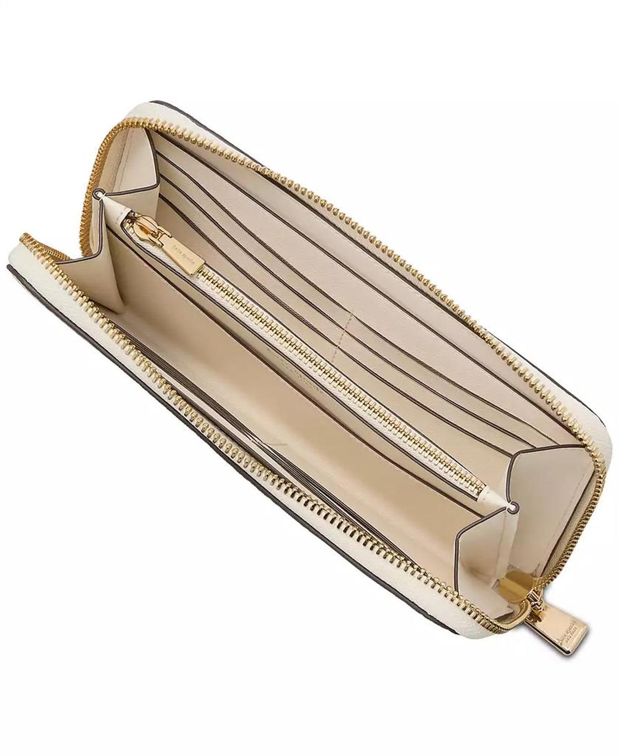 Timeless and functional, this wallet by kate spade new york is crafted in leather and features multiple card slots and a zippered coin pocket, all kept secure with the zip-around closure. 7-3/5"W x 4"H x 1"D; 1 lbs. approx. weight Zip-around closure Gold-tone hardware, foil printed logo, exterior back slip pocket, interior center zippered coin pocket, 12 card slots & 2 slip pockets Leather Spot clean Imported