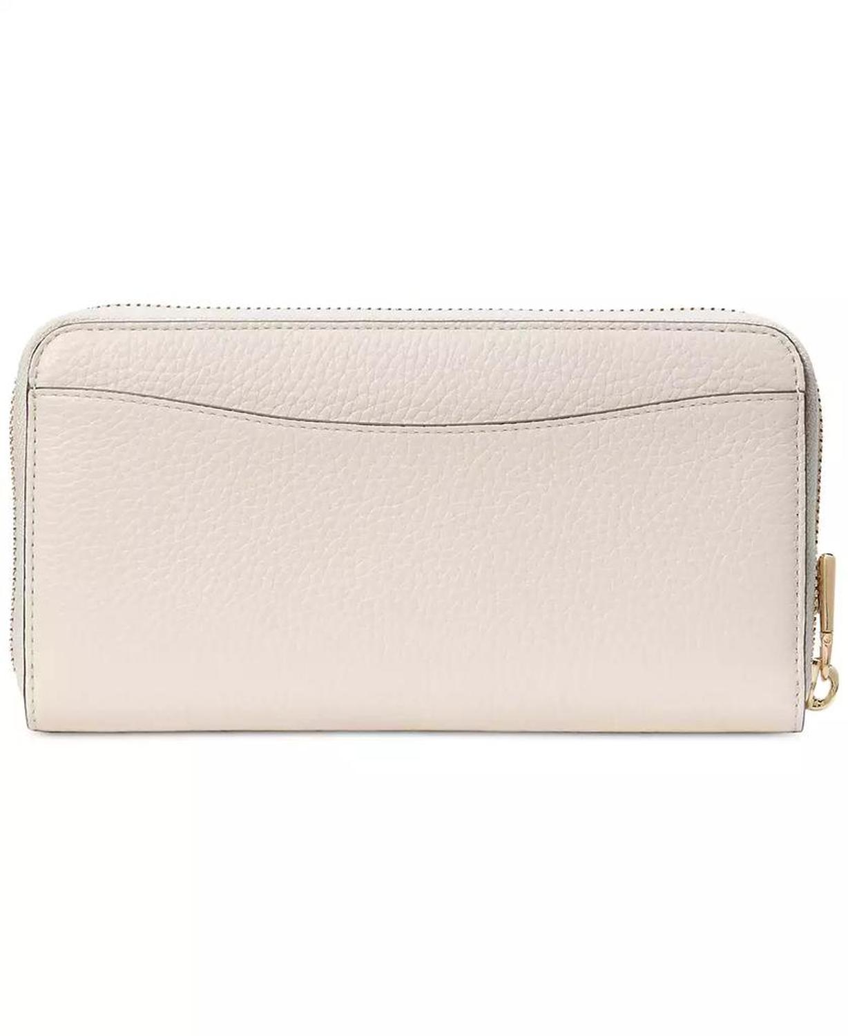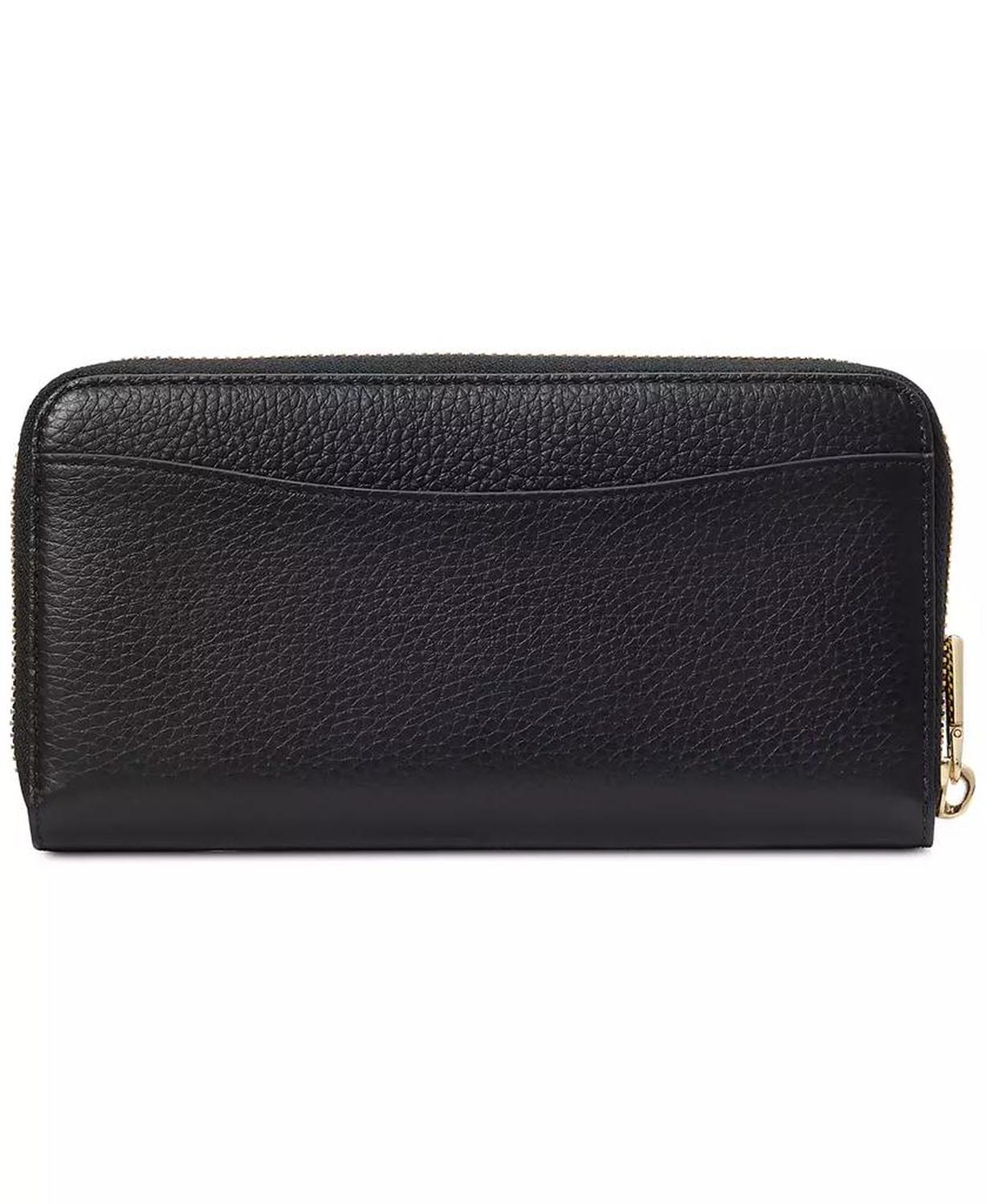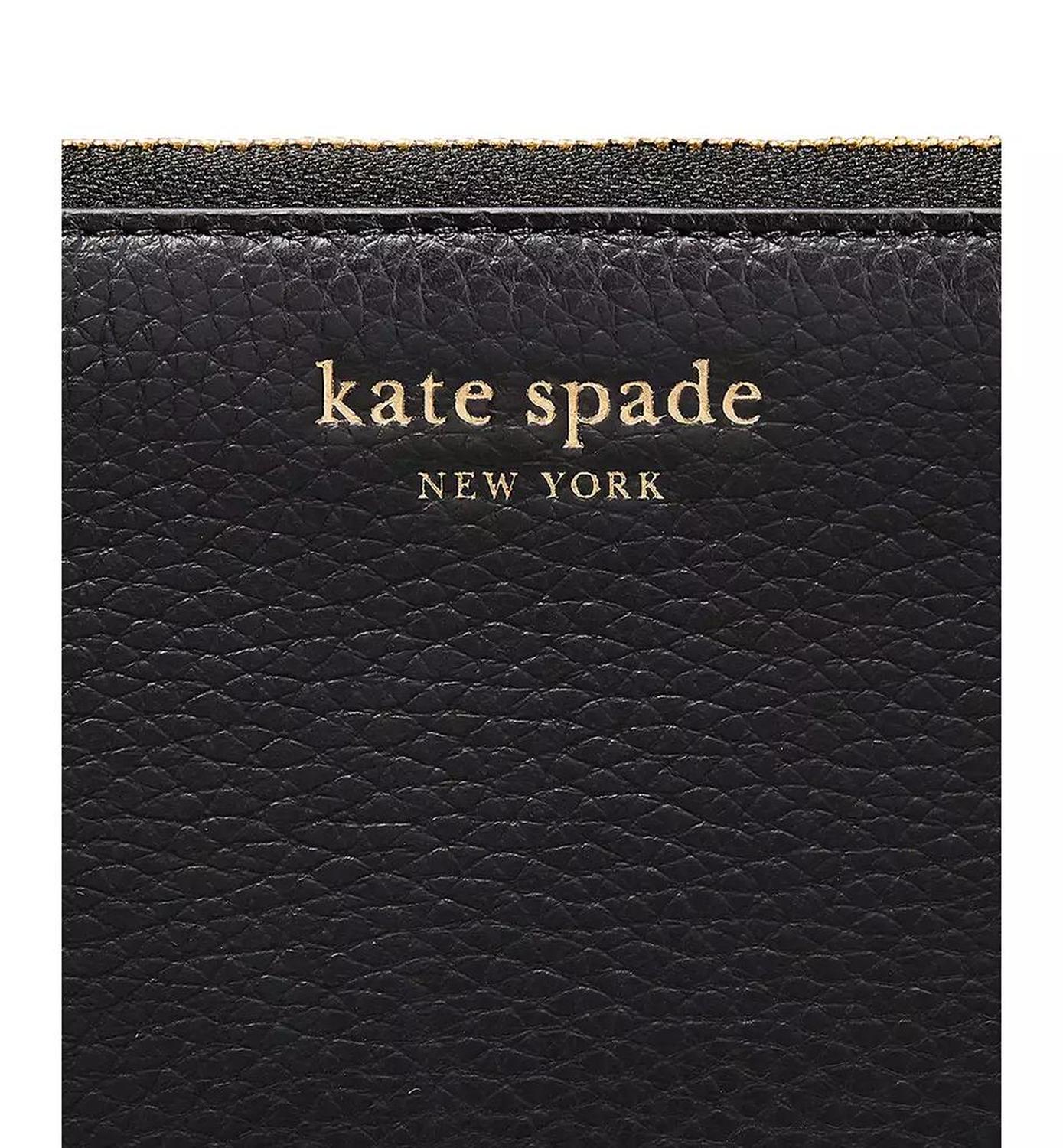 Timeless and functional, this wallet by kate spade new york is crafted in leather and features multiple card slots and a zippered coin pocket, all kept secure with the zip-around closure. 7-3/5"W x 4"H x 1"D; 1 lbs. approx. weight Zip-around closure Gold-tone hardware, foil printed logo, exterior back slip pocket, interior center zippered coin pocket, 12 card slots & 2 slip pockets Leather Spot clean Imported