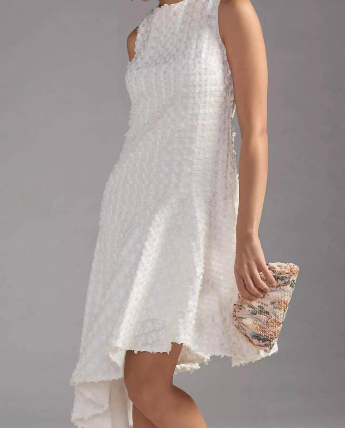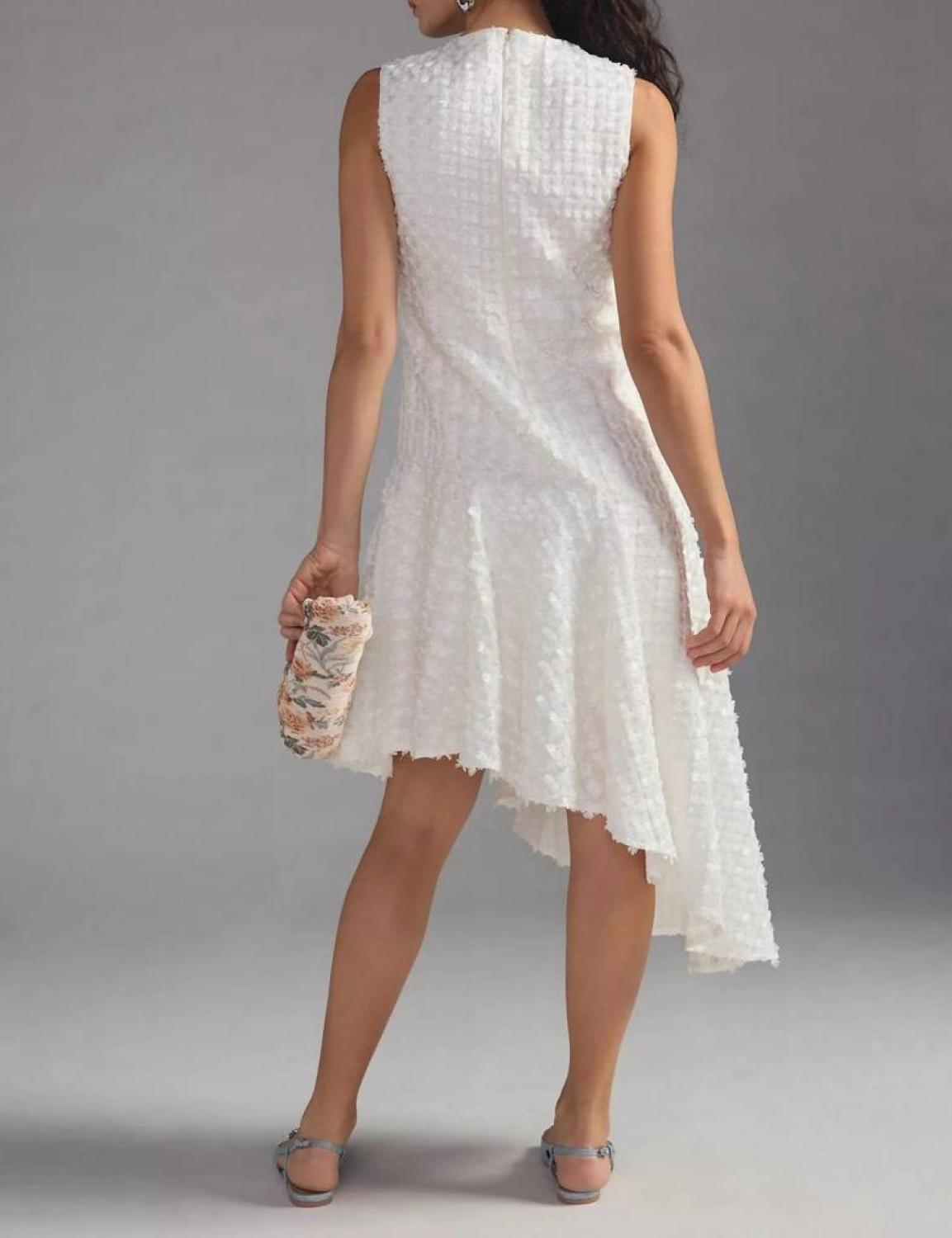 • Show off just the right amount of skin in this adorable assymetrical dress.100% Polyester Featuring a white textured finish, asymmetrical hem, round neck, and back zip closure, this fully lined. Hand wash. Imported