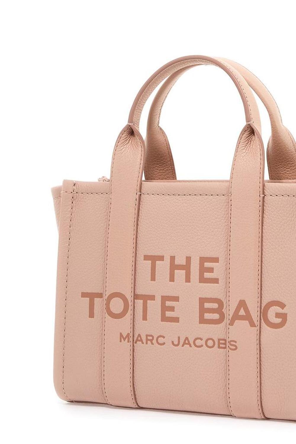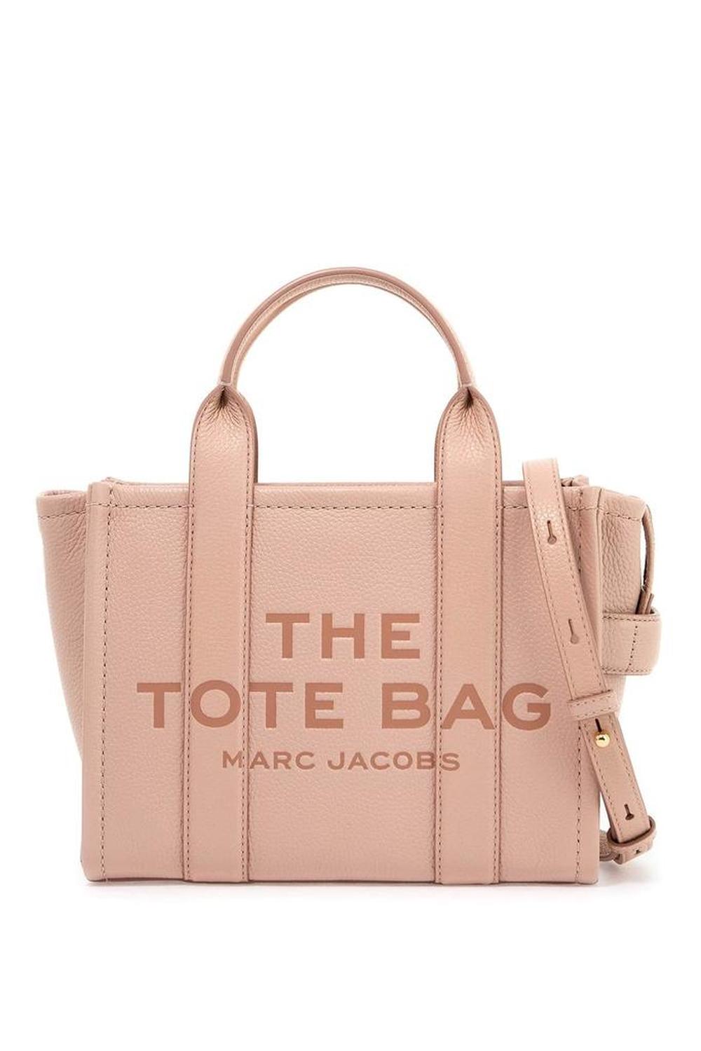 The Leather Small Tote Bag by Marc Jacobs in grained leather featuring double top handle, adjustable and removable shoulder strap, front debossed logo and back leather logo patch. It features zip closure, side handle, unlined interior with a fabric open flat pocket and a leather credit card slot. Gold-finished metalware.