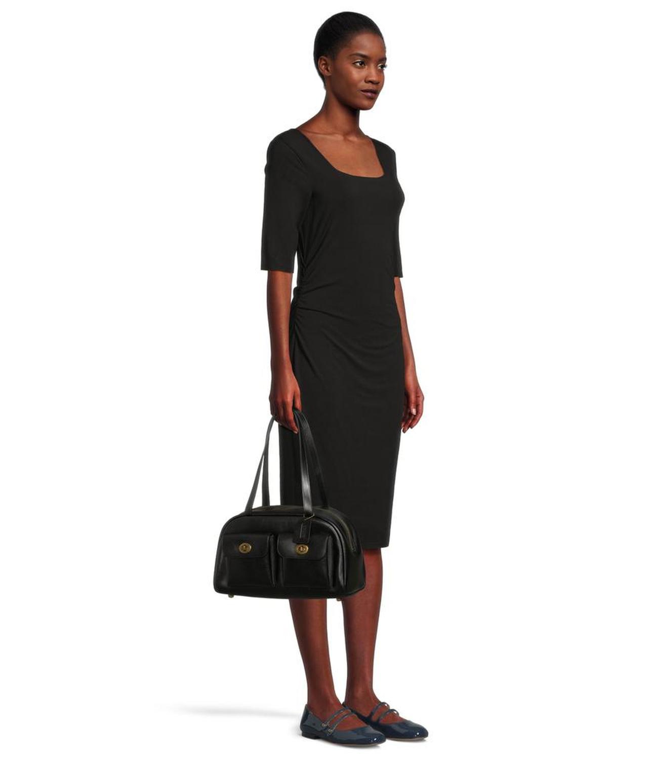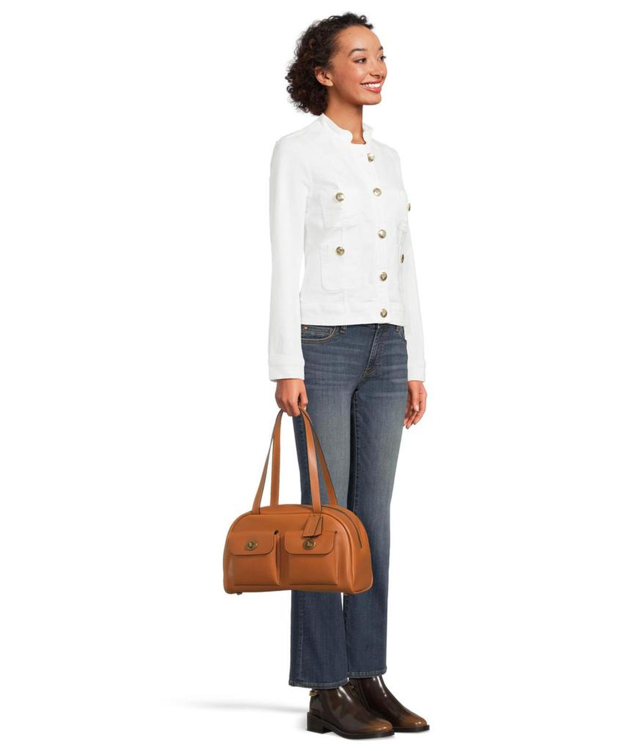 Update your style statement by carrying the COACH™ Twin Turnlock Bag, crafted with waxed smooth leather. The bag features a zippered closure, an internal snap pocket, two flap turnlock pockets on the front, four protective feet at base, and two shoulder straps.