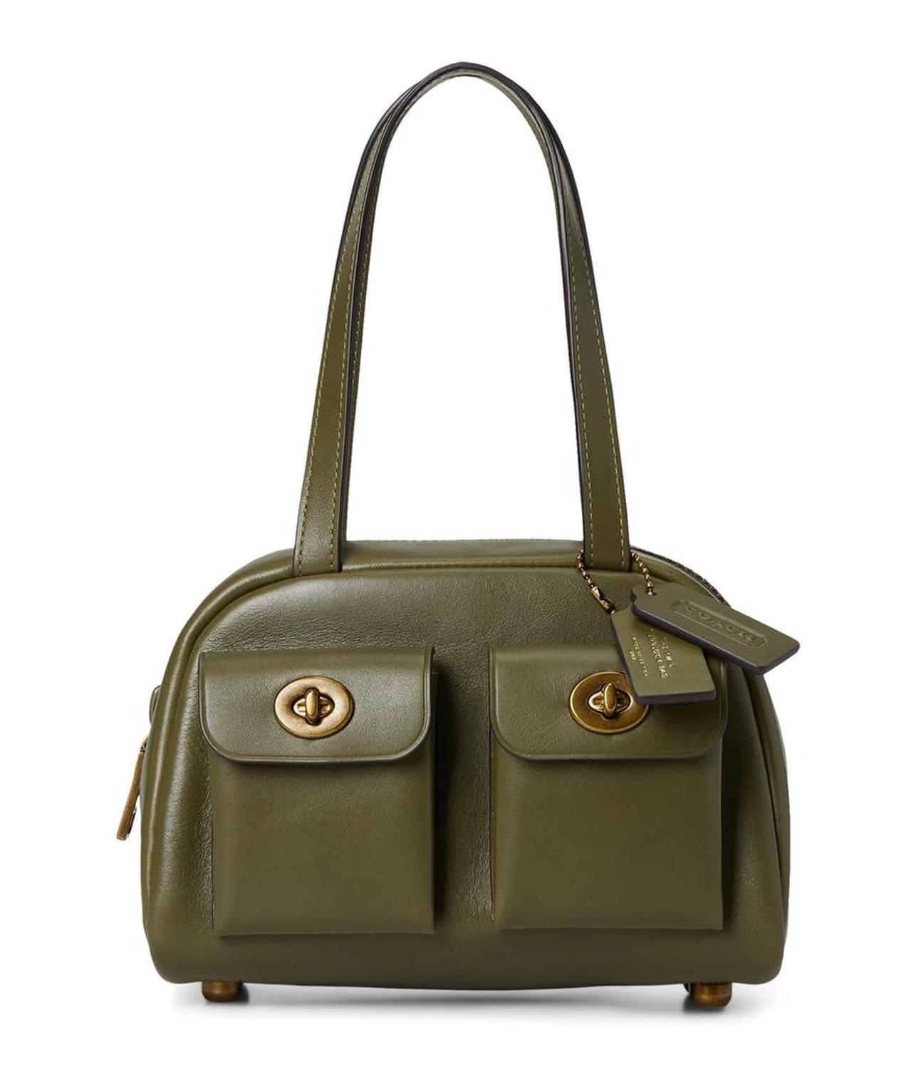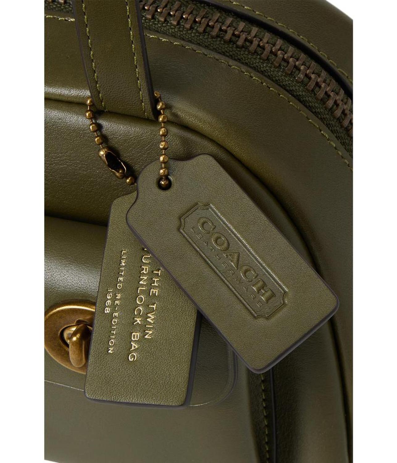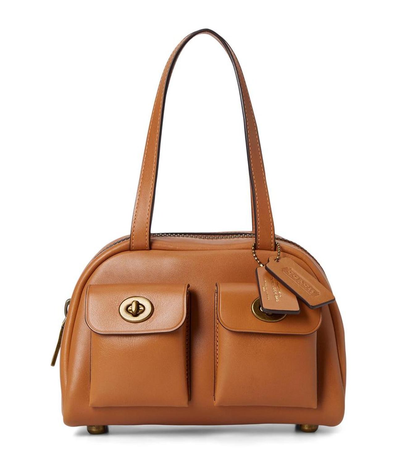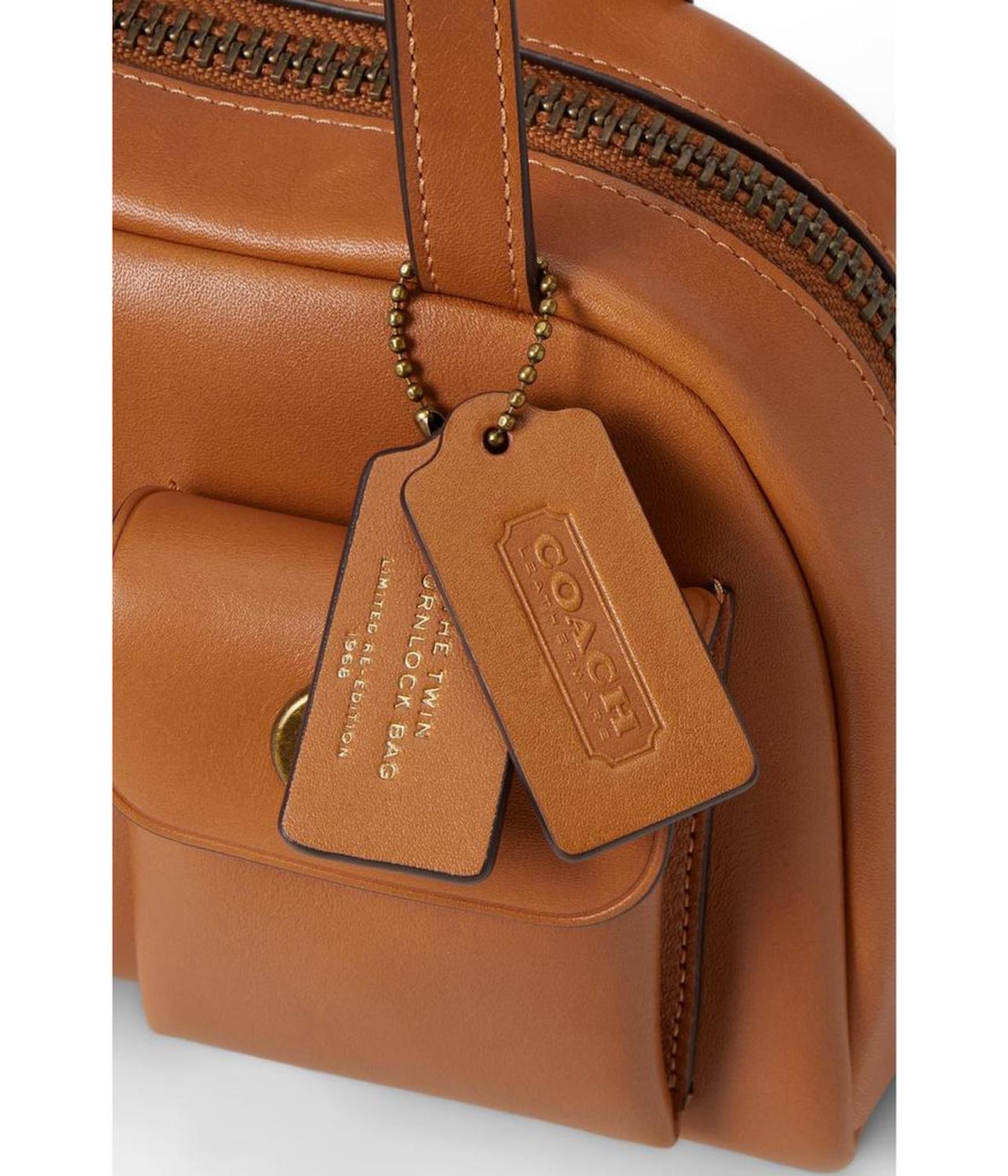 The COACH™ Twin Turnlock Bag 20 is a hand-carry bag with four protective feet at the base for convenient carrying. Made from waxed smooth leather, this luggage bag is designed with dual grab handles and a zippered top closure. With its two outside turnlock pockets, an interior compartment, and an inside snap pocket, this leather bag offers enough space for all your essentials.