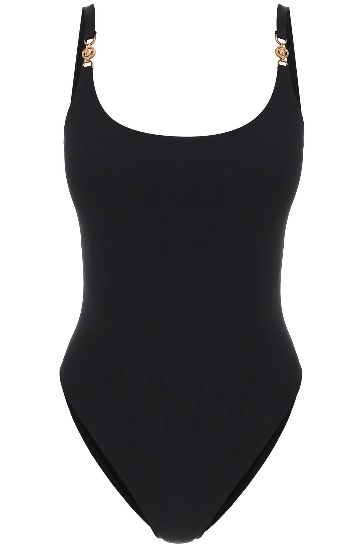 Versace one-piece swimwear crafted in lycra with straps embellished with gold-tone metal Medusa '95 details. It features scoop neck and inner lining. The model is 177 cm tall and wears size 1.