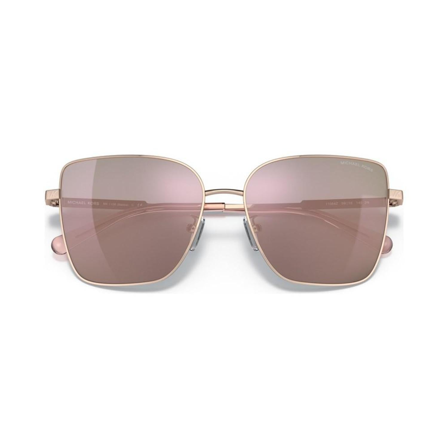 Feminine butterfly, adjustable nosepads. Classic galvanic colors paired with feminine mirrors, gradients, and polar lenses. NEW stainless steel temple with engraved MK repeat logo. Plastic temple tip for comfort. Frame shape- Butterfly Frame material- Steel Frame type- Full rim Gender- Female Eye/Bridge/Temple width- 57/16/145 Lens features- Solid color - mirror Best for face shape- Oval, heart, square Low bridge fit- No This frame is not compatible with prescription lenses Steel Wipe Clean Imported