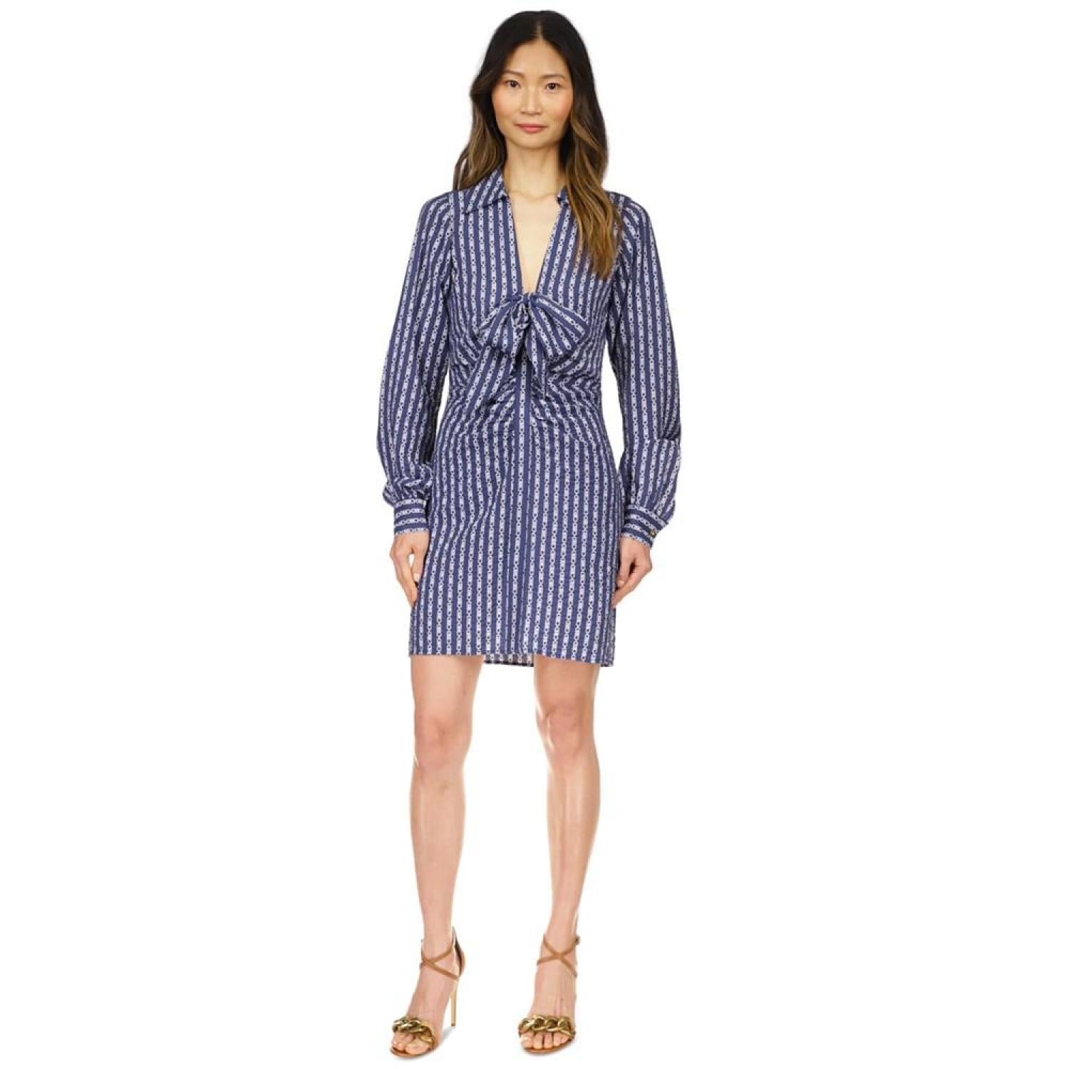 The key to a chic look: MICHAEL Michael Kors' chain-print dress, featuring a tie front. Approx. 36" long at front from high point of shoulder Point collar Hidden side zipper Long sleeves Tie at front Lined Shell: viscose, nylon; lining: 100% cotton Dry clean Imported