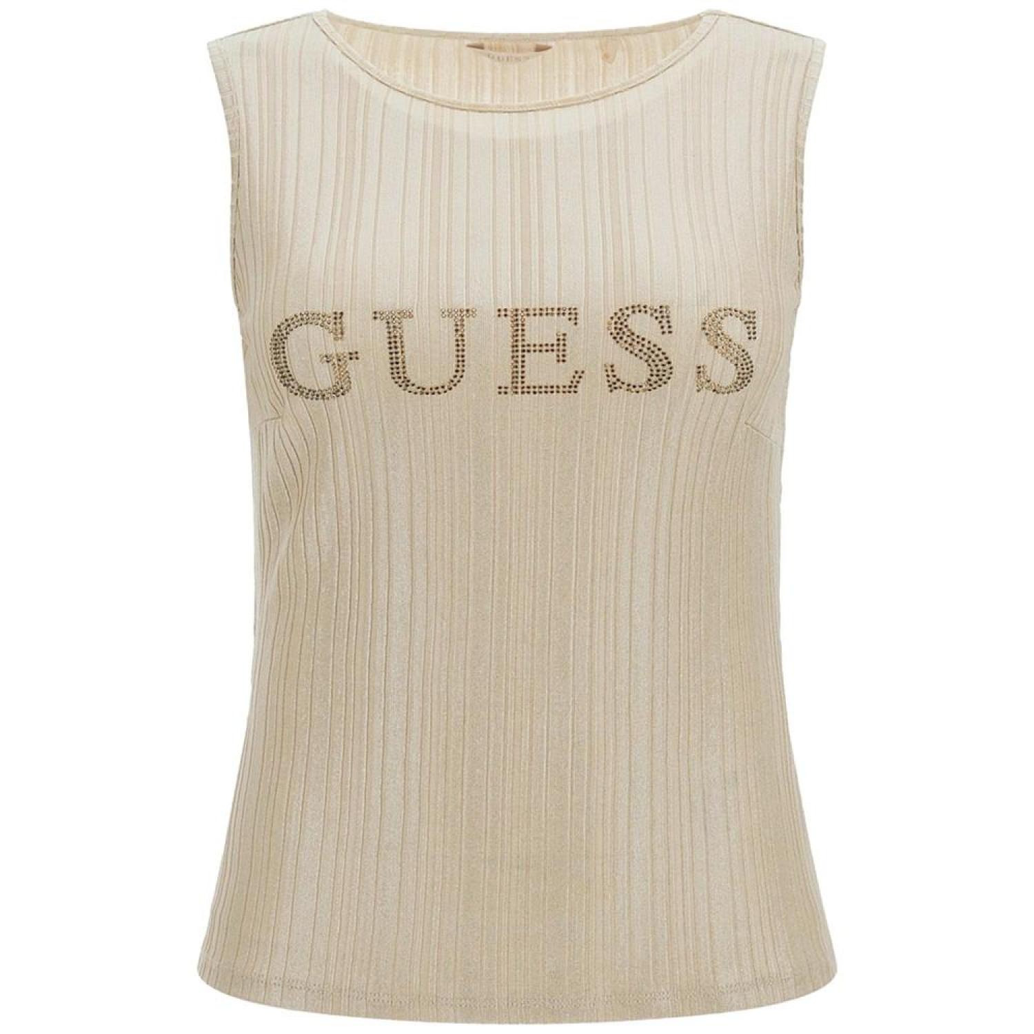 Allover sheen with studded shine at the front logo: the GUESS Cristina crewneck top sets any look aglow. Approx. model height is 5'10" and she is wearing a size small Fitted Crewneck Studded logo at chest Shimmery mixed-rib knit Sleeveless Polyester, elastane spandex Hand wash Imported