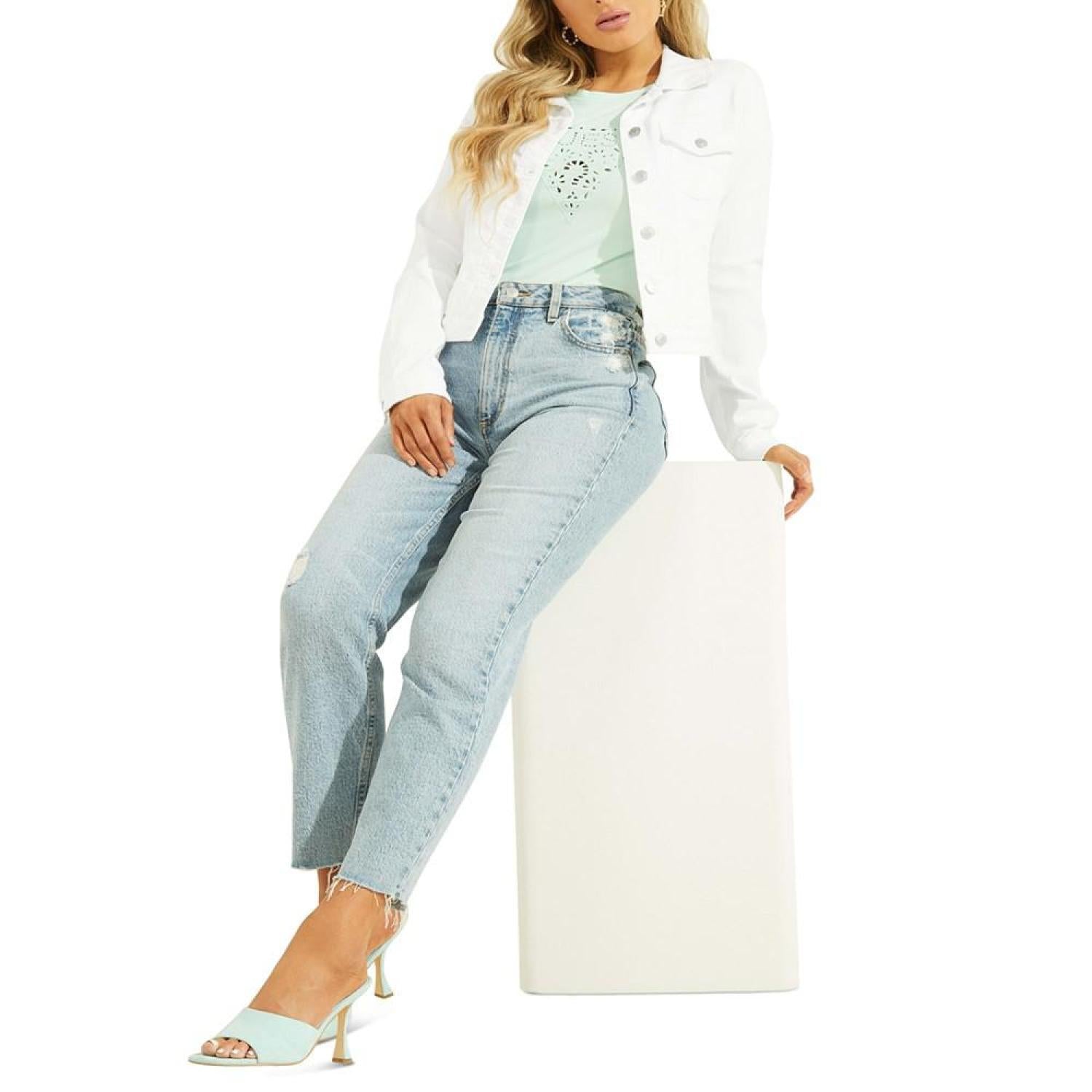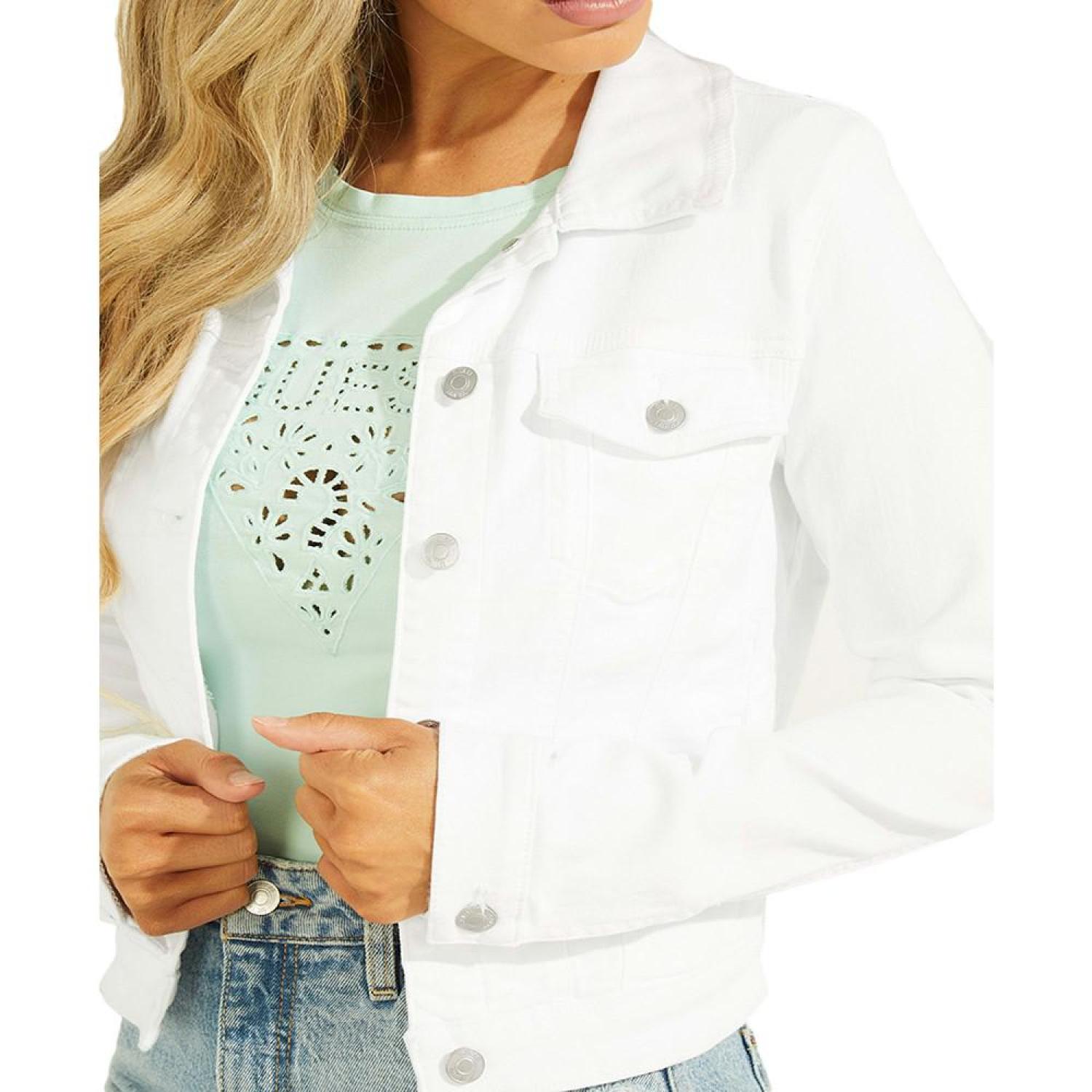 GUESS gives you a classic wardrobe essential in a white hot hue with this chic trucker jacket, a denim design that works with everything from jeans and a T-shirt to a maxi dress.