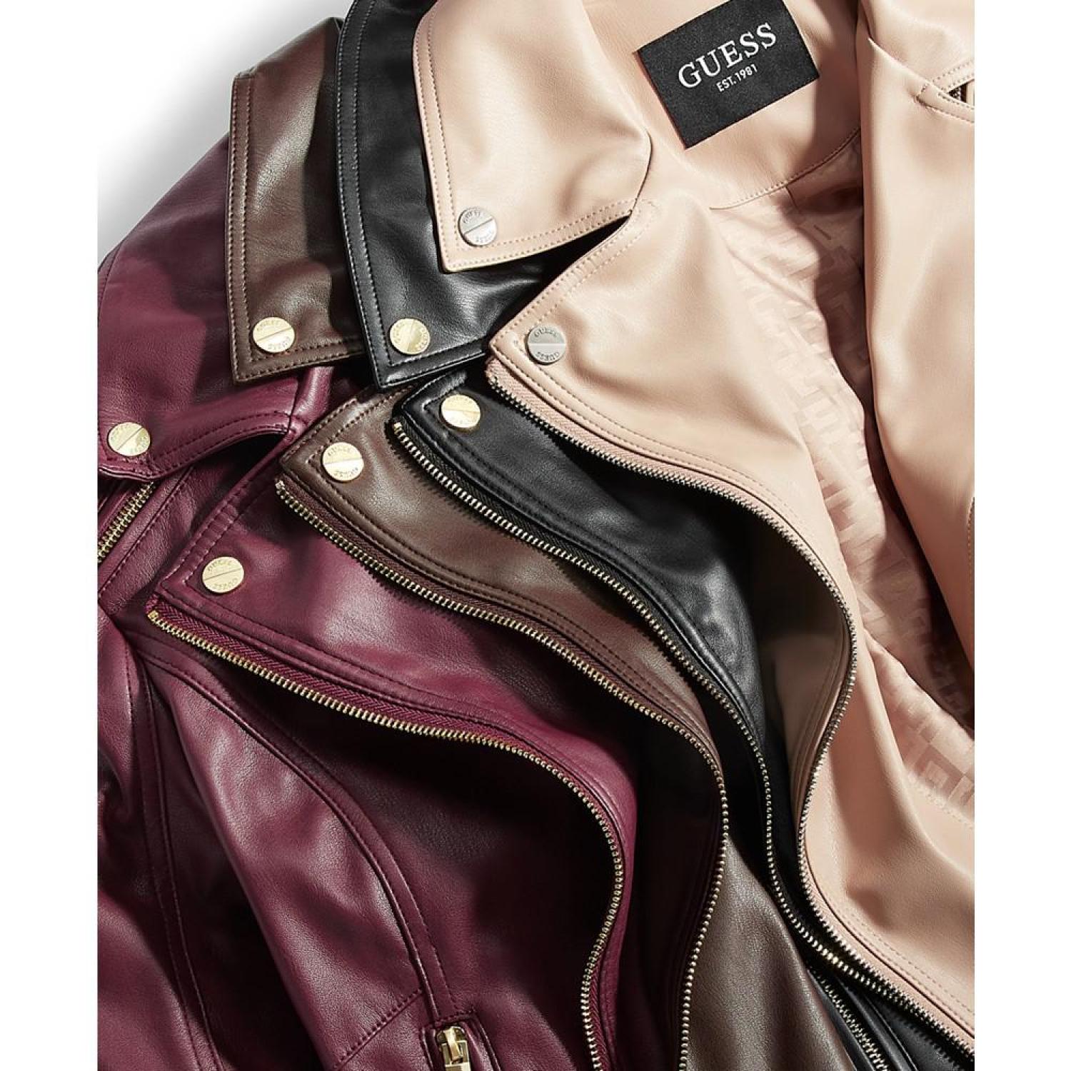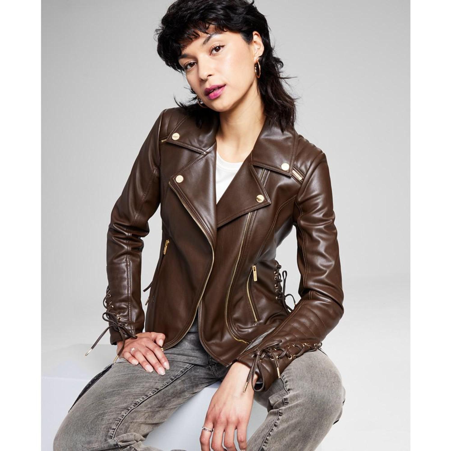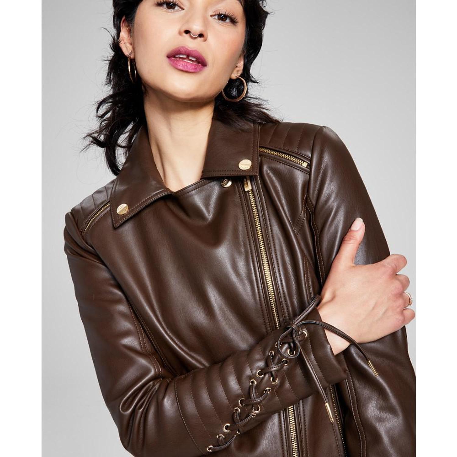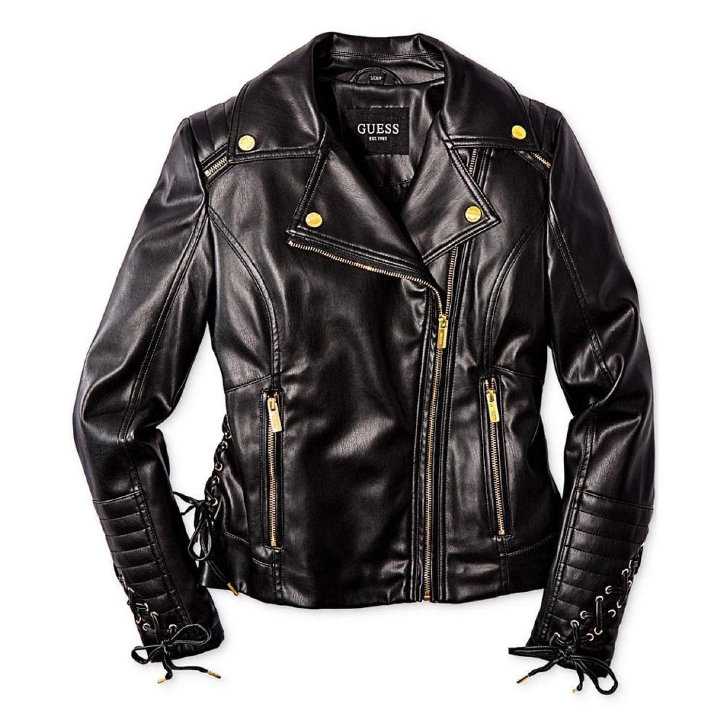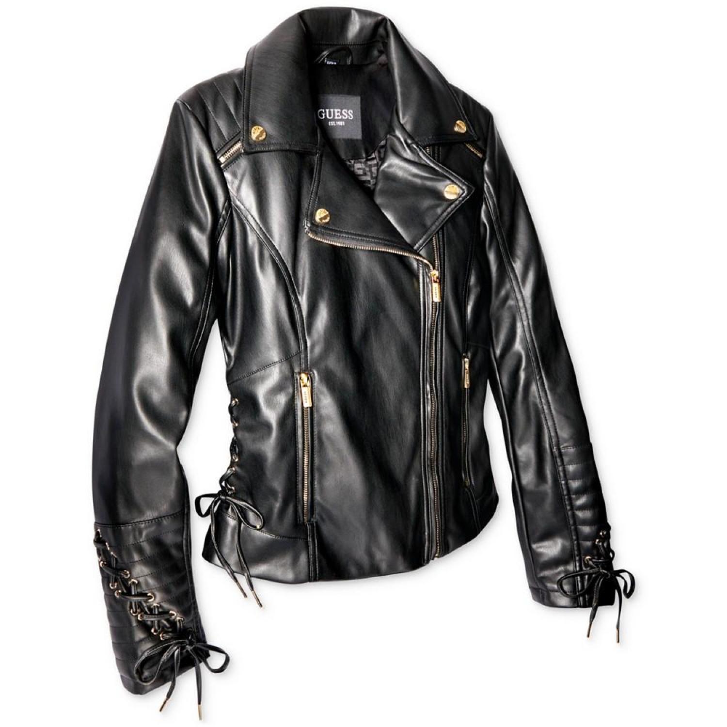• Lace-up accents at each sleeve and side seam lend a little beauty to this sleek faux-leather moto coat from GUESS.