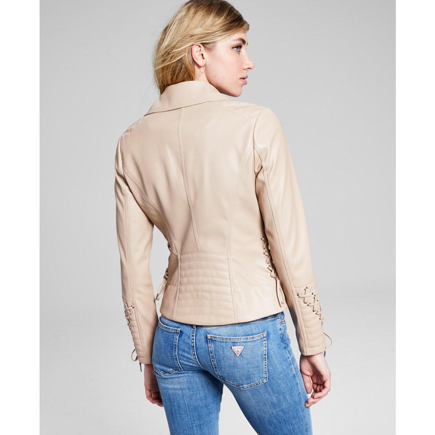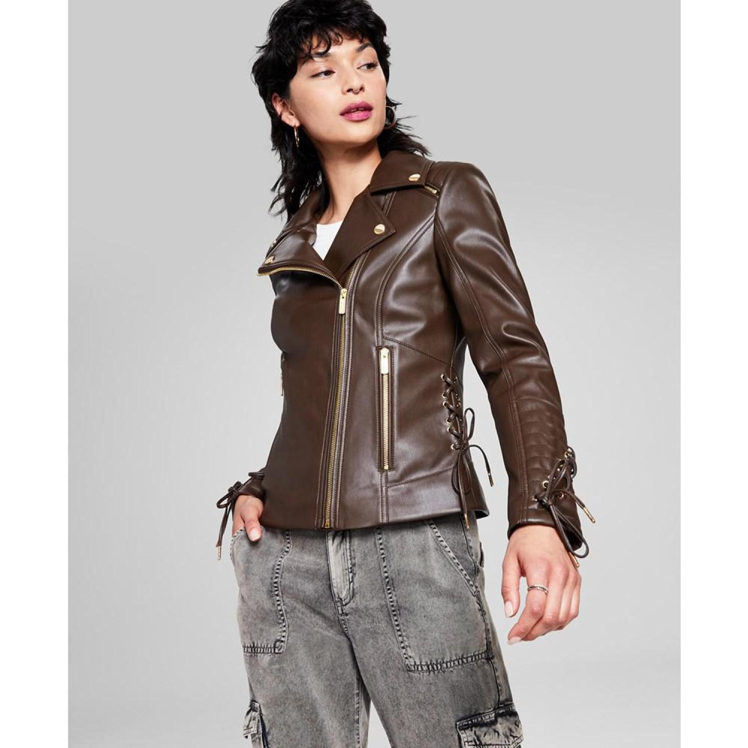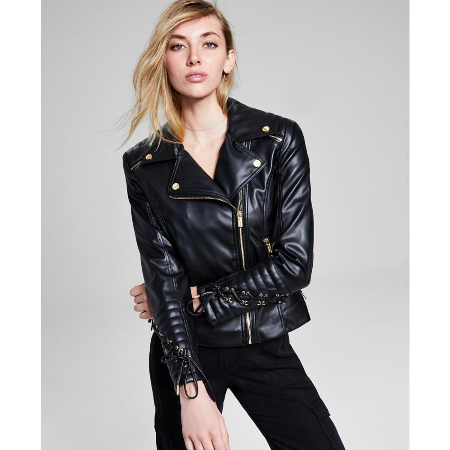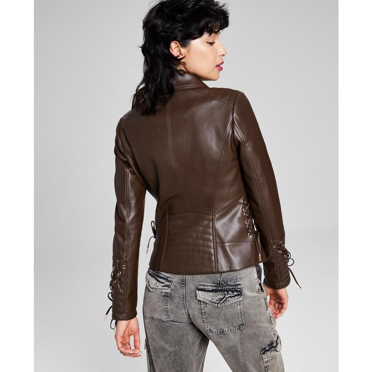 Lace-up accents at each sleeve and side seam lend a little beauty to this sleek faux-leather moto coat from GUESS.