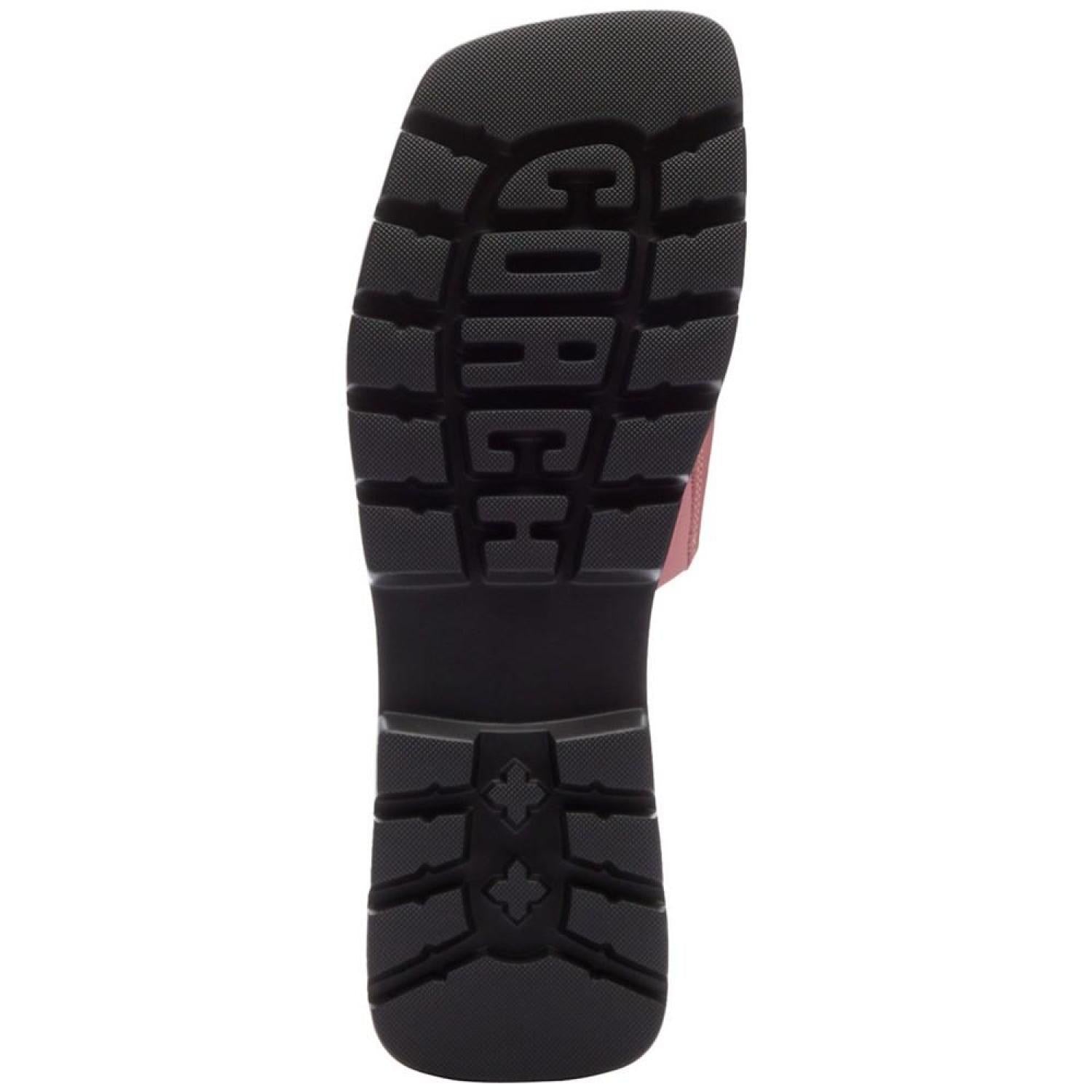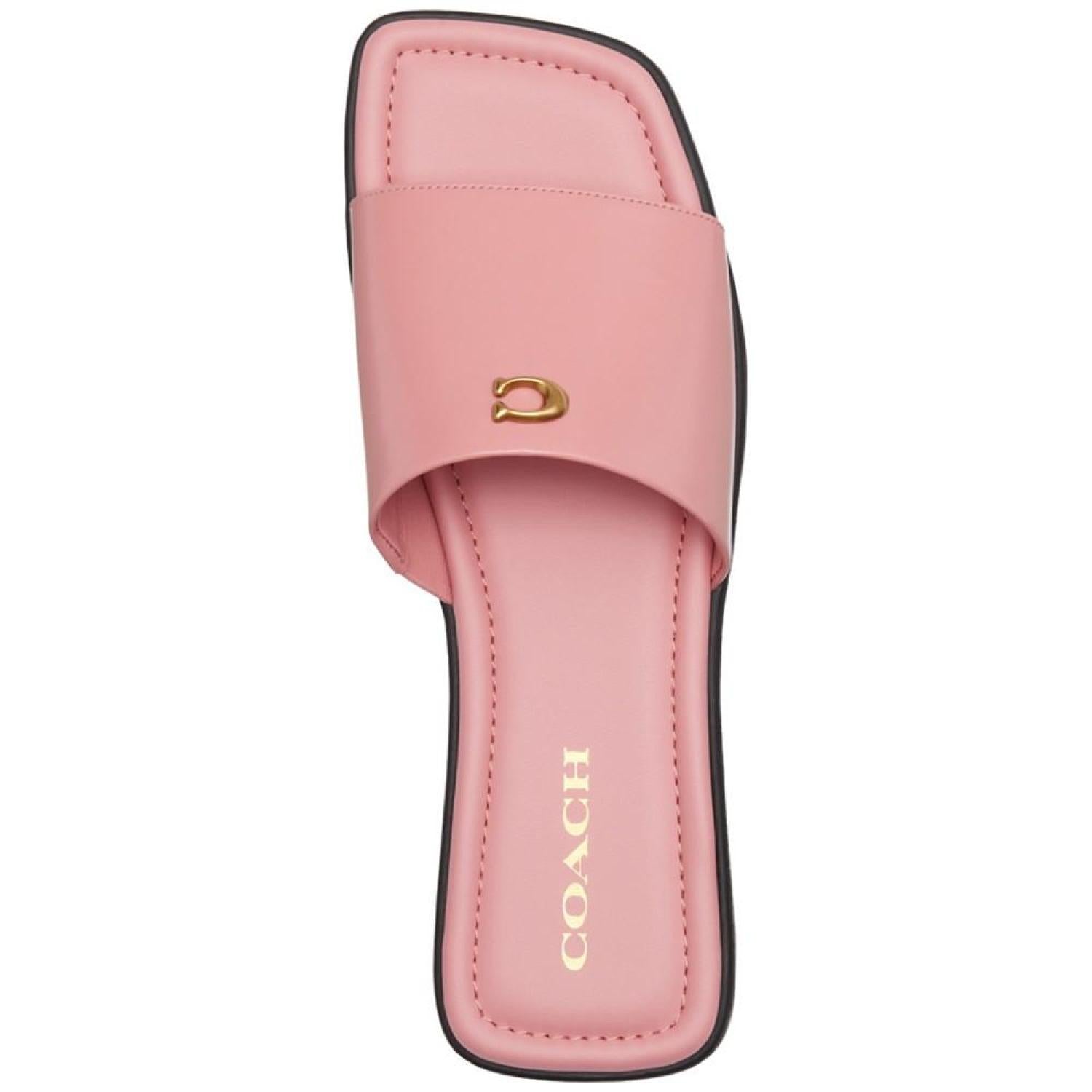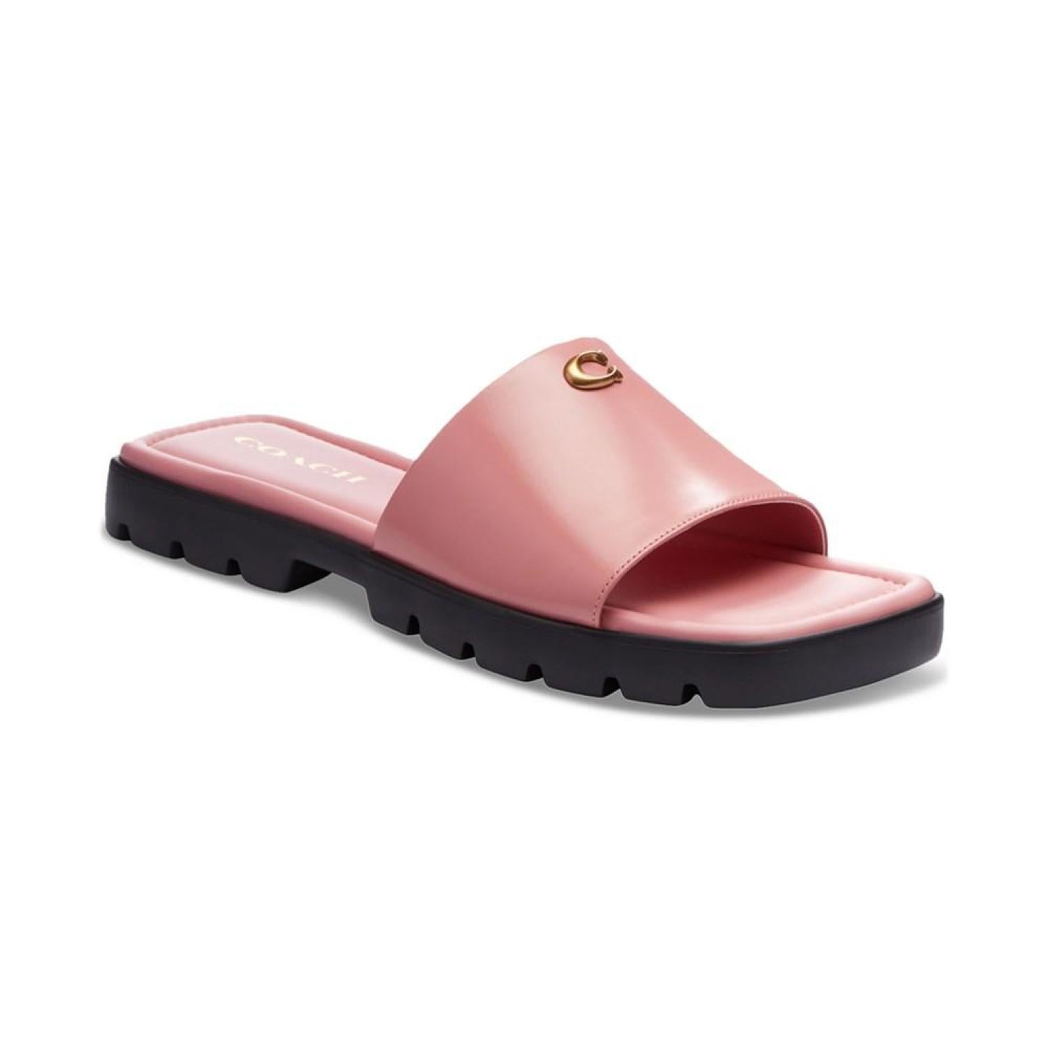 • Square toes and lug soles update easy slip-on style in the COACH Florence slides.