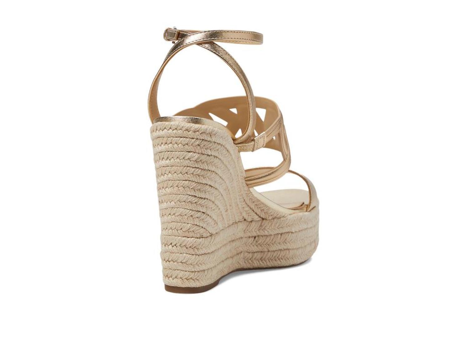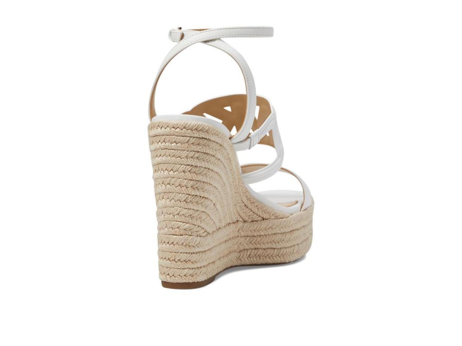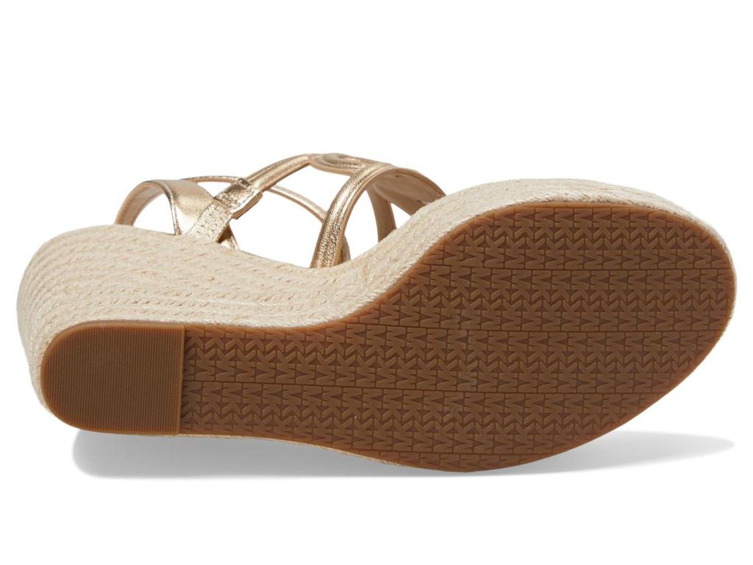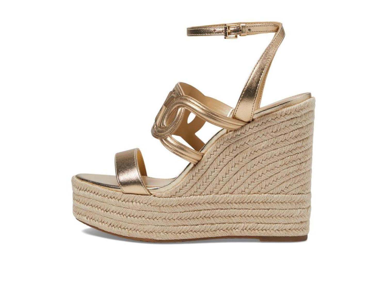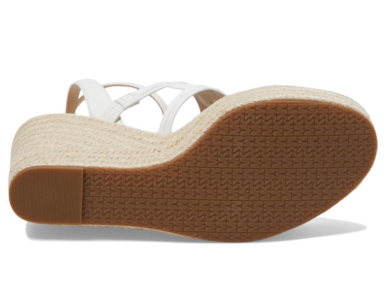 • Elevate your warm weather wardrobe in the MICHAEL Michael Kors® Alma Wedge Espadrille. These sandals feature a molded leather branded upper with a round, open toe silhouette, lightly padded insole with a roller buckle ankle strap closure, and a jute wrapped wedge heel.