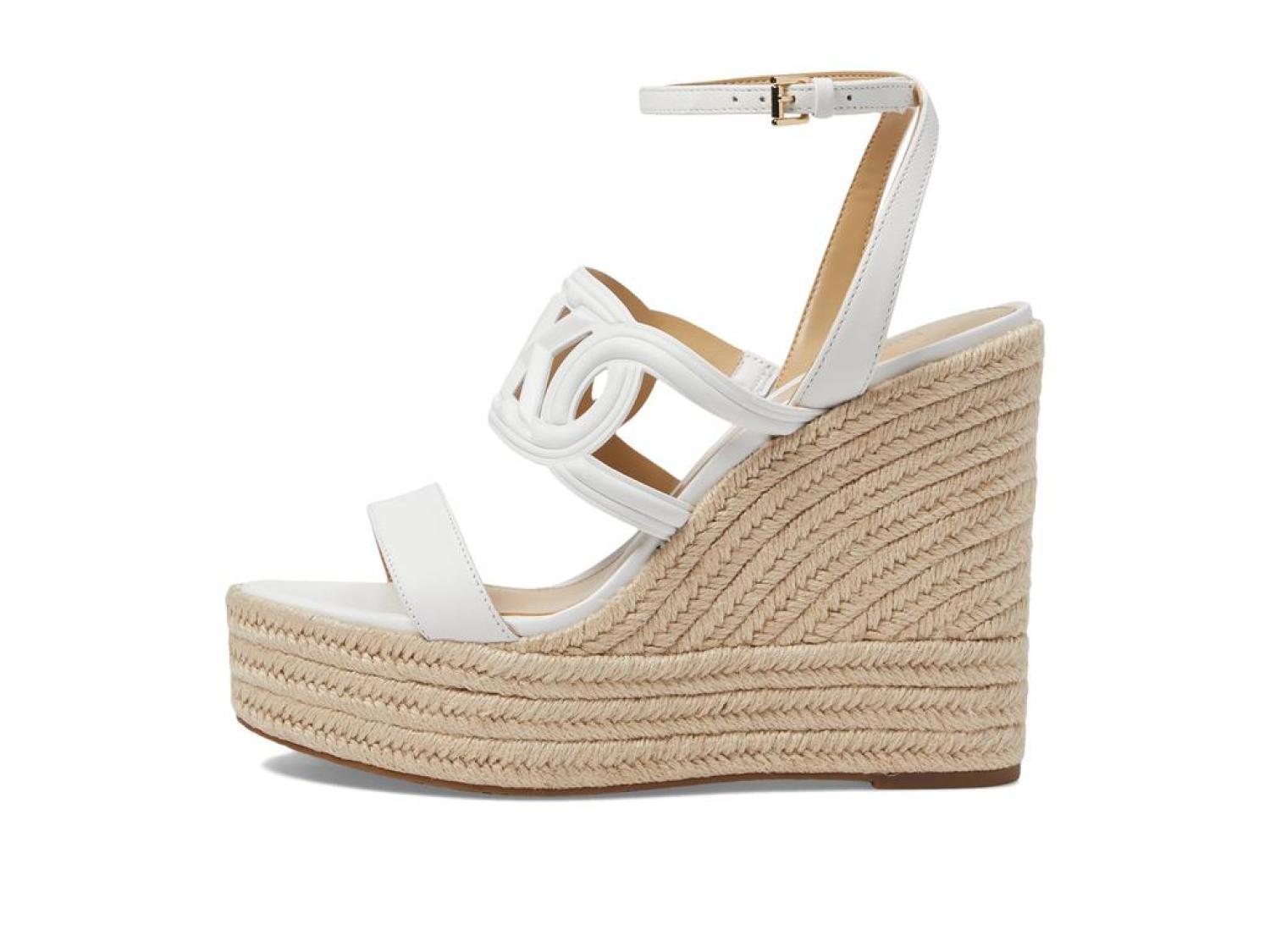 Elevate your warm weather wardrobe in the MICHAEL Michael Kors® Alma Wedge Espadrille. These sandals feature a molded leather branded upper with a round, open toe silhouette, lightly padded insole with a roller buckle ankle strap closure, and a jute wrapped wedge heel.