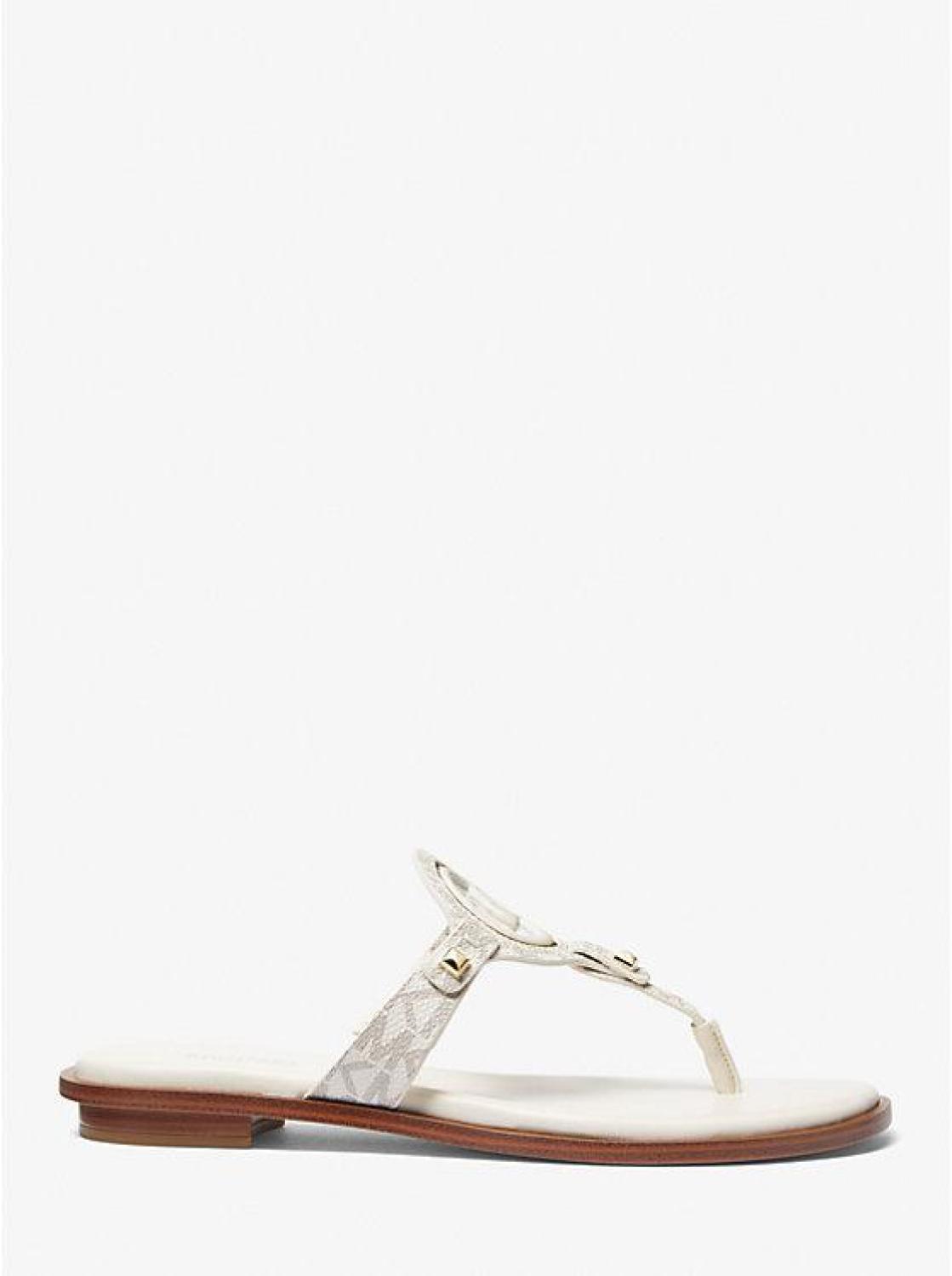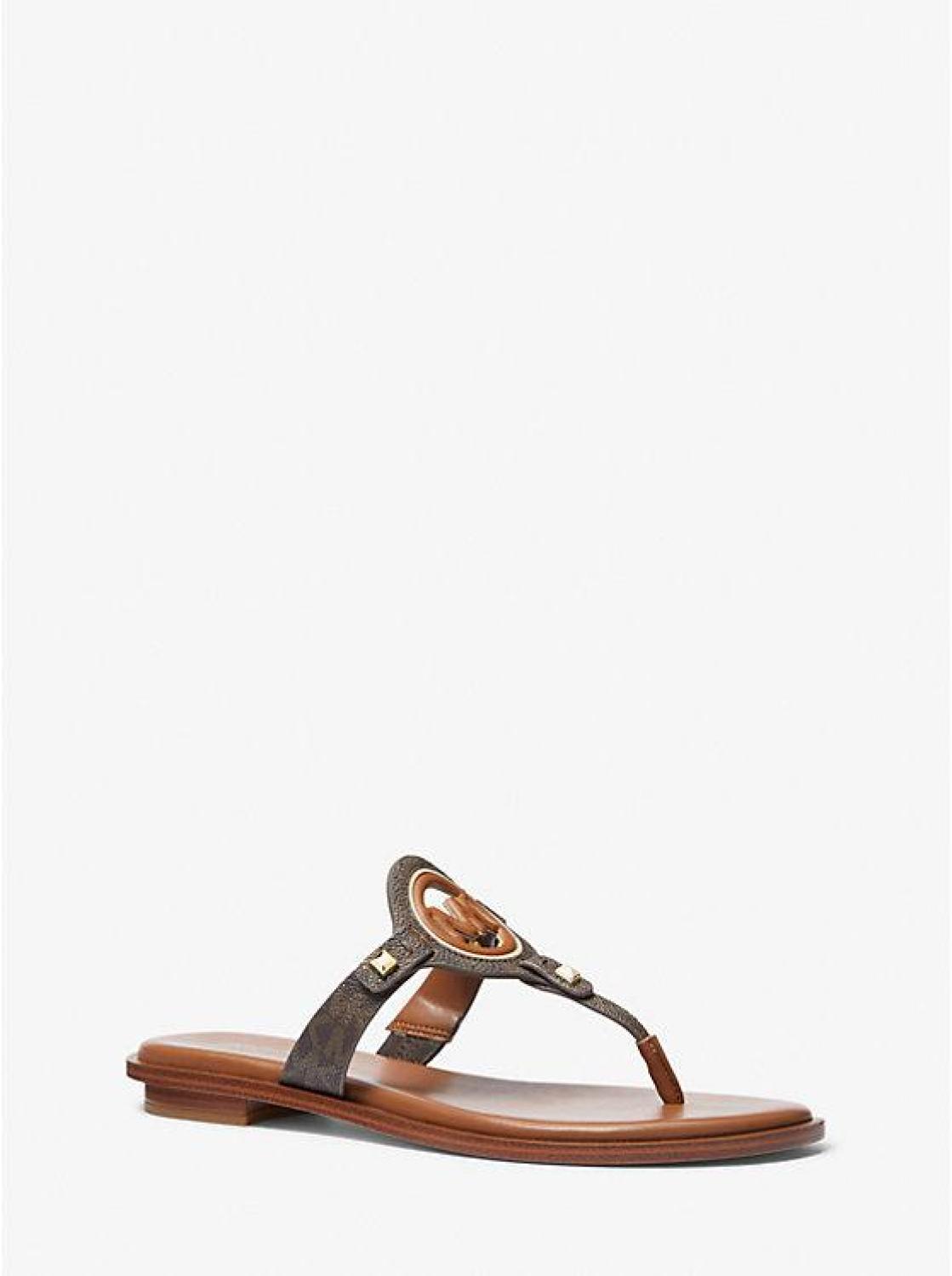 • Meet Aubrey, the shoe you’ll reach for on the hottest of days. Embellished with luxe pyramid studs, these sandals feature a cutout logo accent that renders them instantly recognizable. They’re made from a mix of Signature Logo print and leather in a T-strap design, with an almond toe and slight heel. Wear them with anything from printed dresses to cropped jeans.