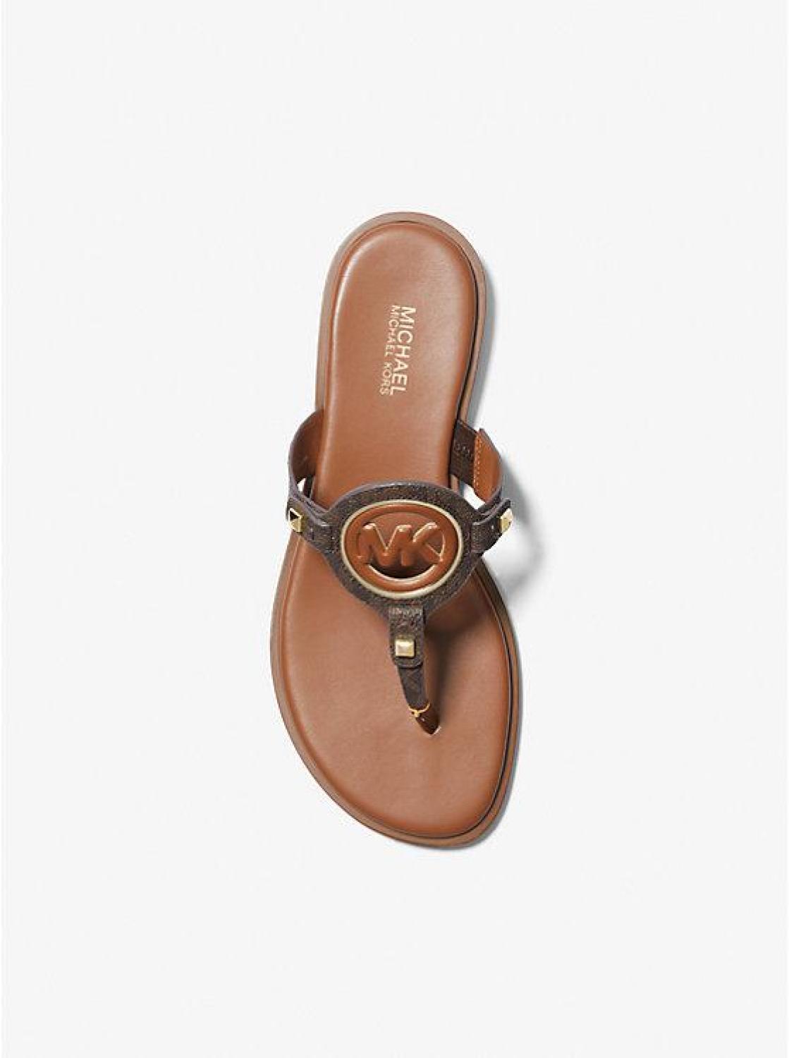 Meet Aubrey, the shoe you’ll reach for on the hottest of days. Embellished with luxe pyramid studs, these sandals feature a cutout logo accent that renders them instantly recognizable. They’re made from a mix of Signature Logo print and leather in a T-strap design, with an almond toe and slight heel. Wear them with anything from printed dresses to cropped jeans.
