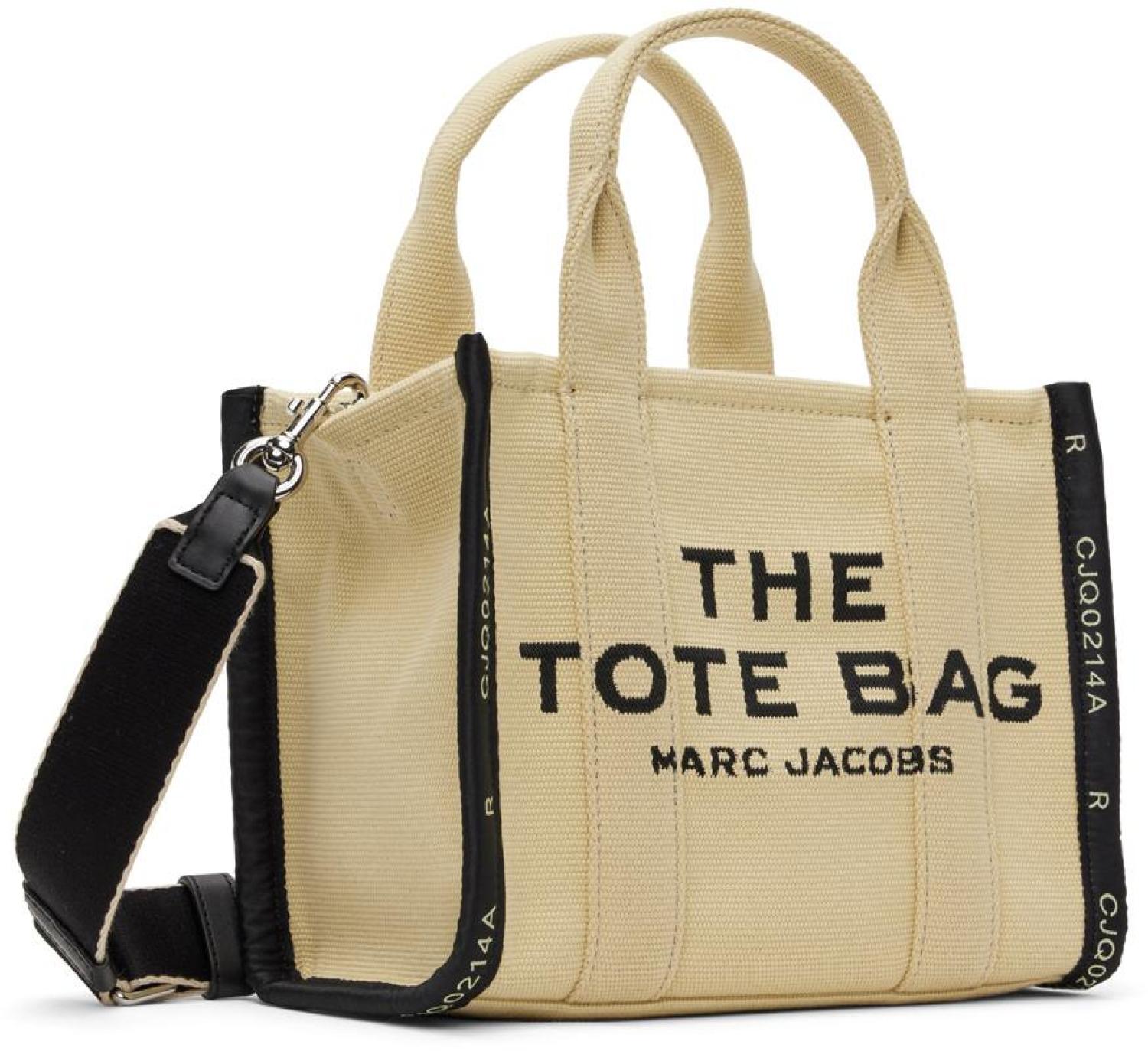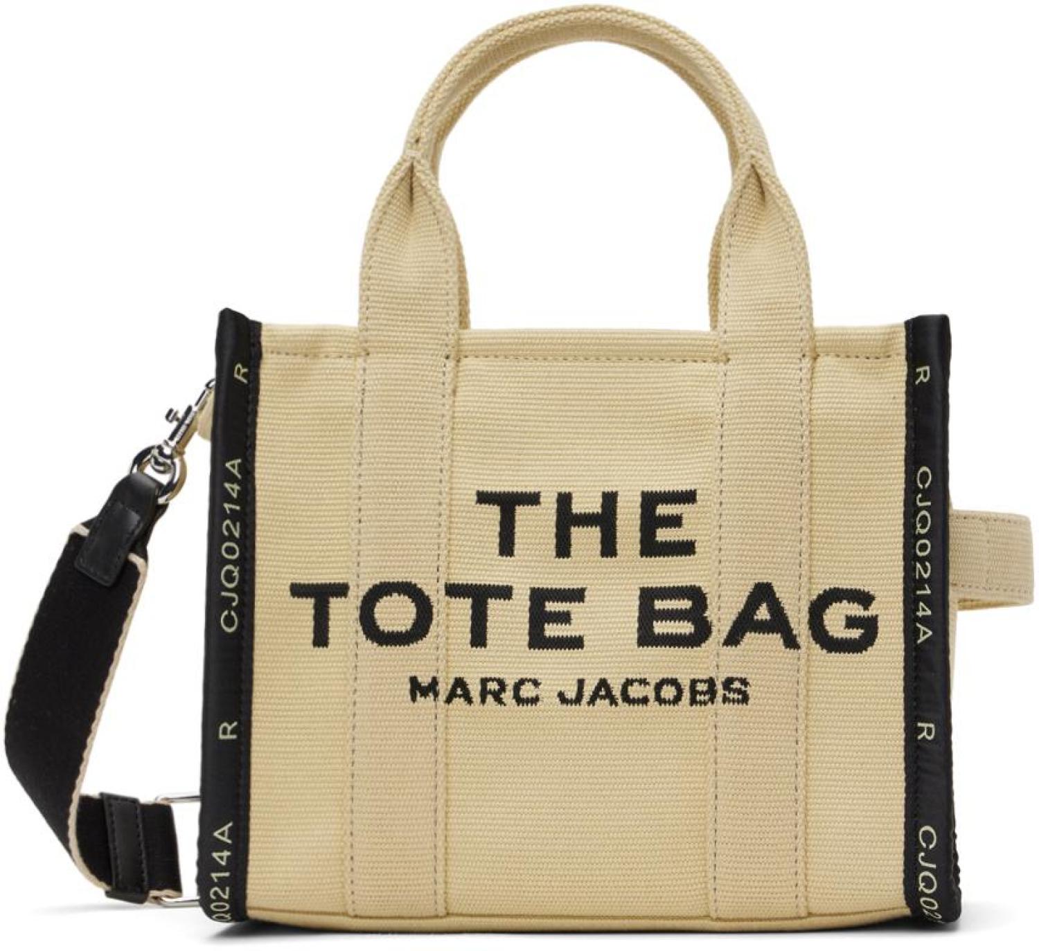 Cotton canvas tote in beige. Jacquard text and logo at face and sides.