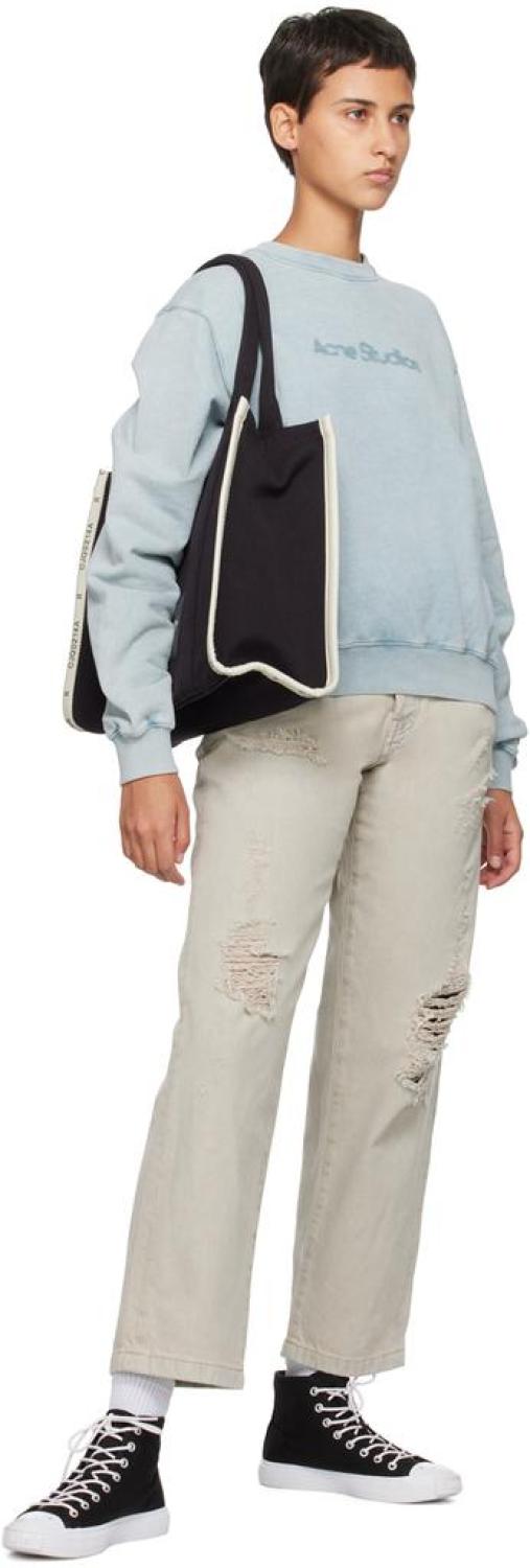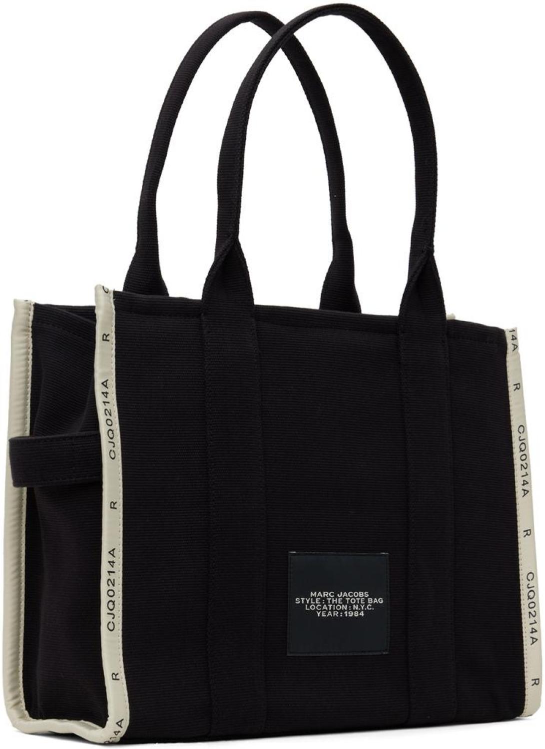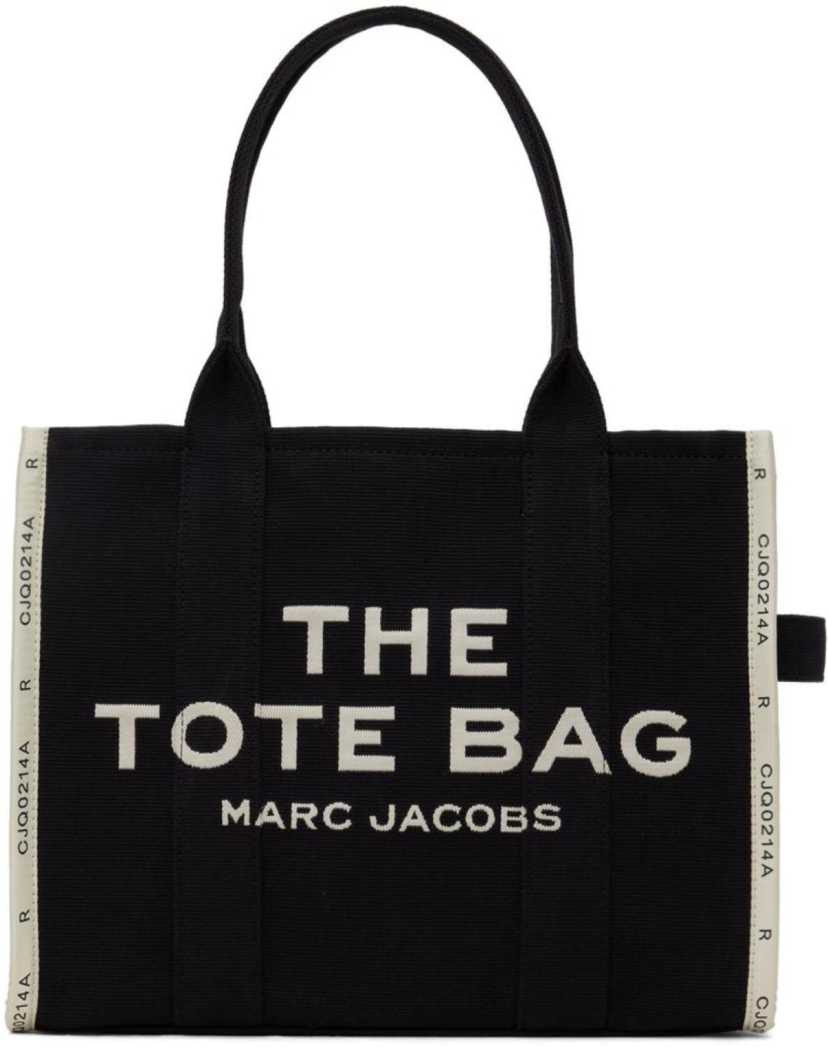 Marc Jacobs Black 'The Jacquard Large' Tote Canvas tote in black. · Jacquard logo and text throughout · Twin rolled carry handles · Logo patch at back face · Zip closure · Patch and zip pockets at interior · Unlined · H13" x W16" x D6.5" Supplier color: Black Textile. Made in Viet Nam. 241190F049024