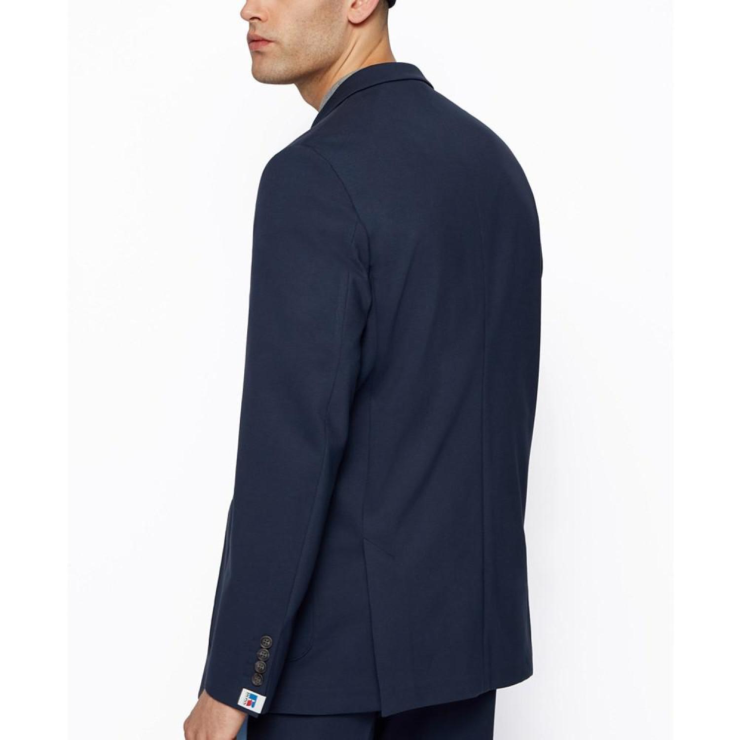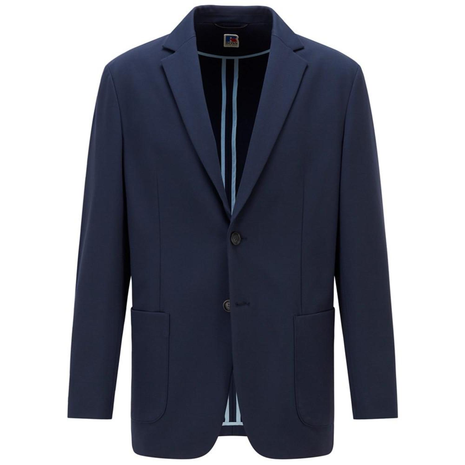 A single-breasted jacket by BOSS Menswear, cut to a regular fit. Designed in mid-weight jersey with stretch for a casual attitude, this modern jacket features contrast binding and exclusive labelling at the interior and left sleeve. Partial lining reinforces the more laid-back approach of this piece. The BOSS x Russell Athletic capsule unites signature style and expert craftsmanship with the aesthetic of an American sportswear icon, creating bold new designs for the next generation.