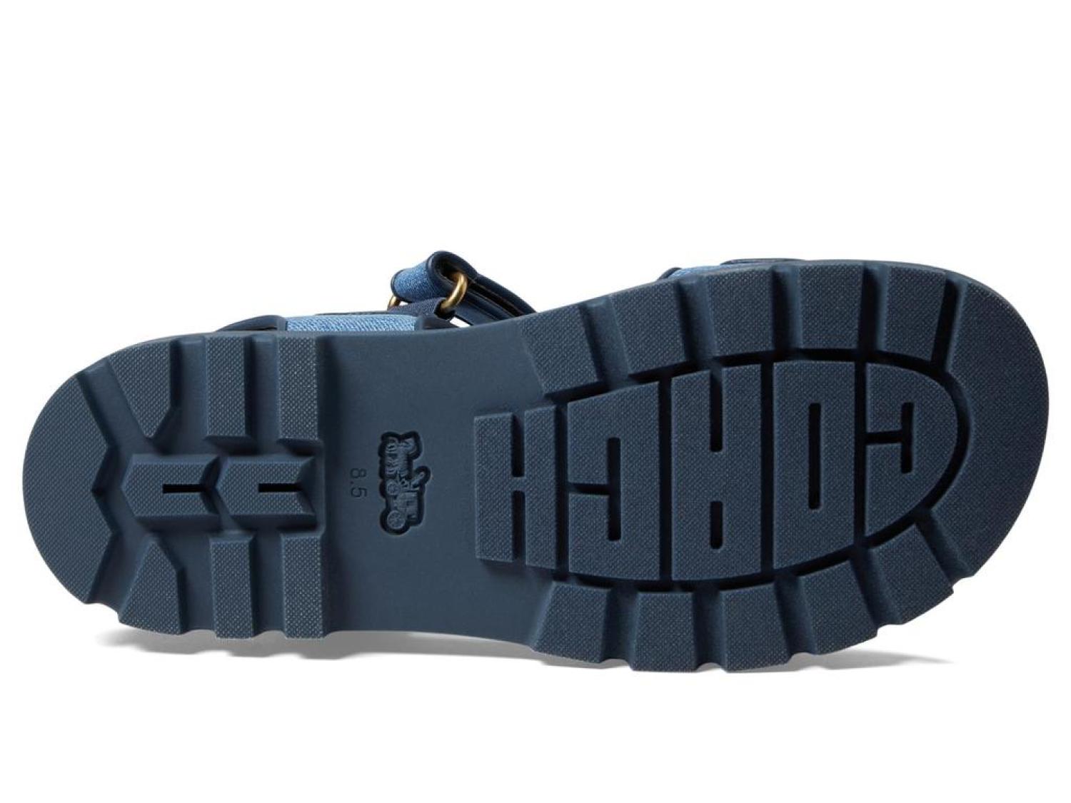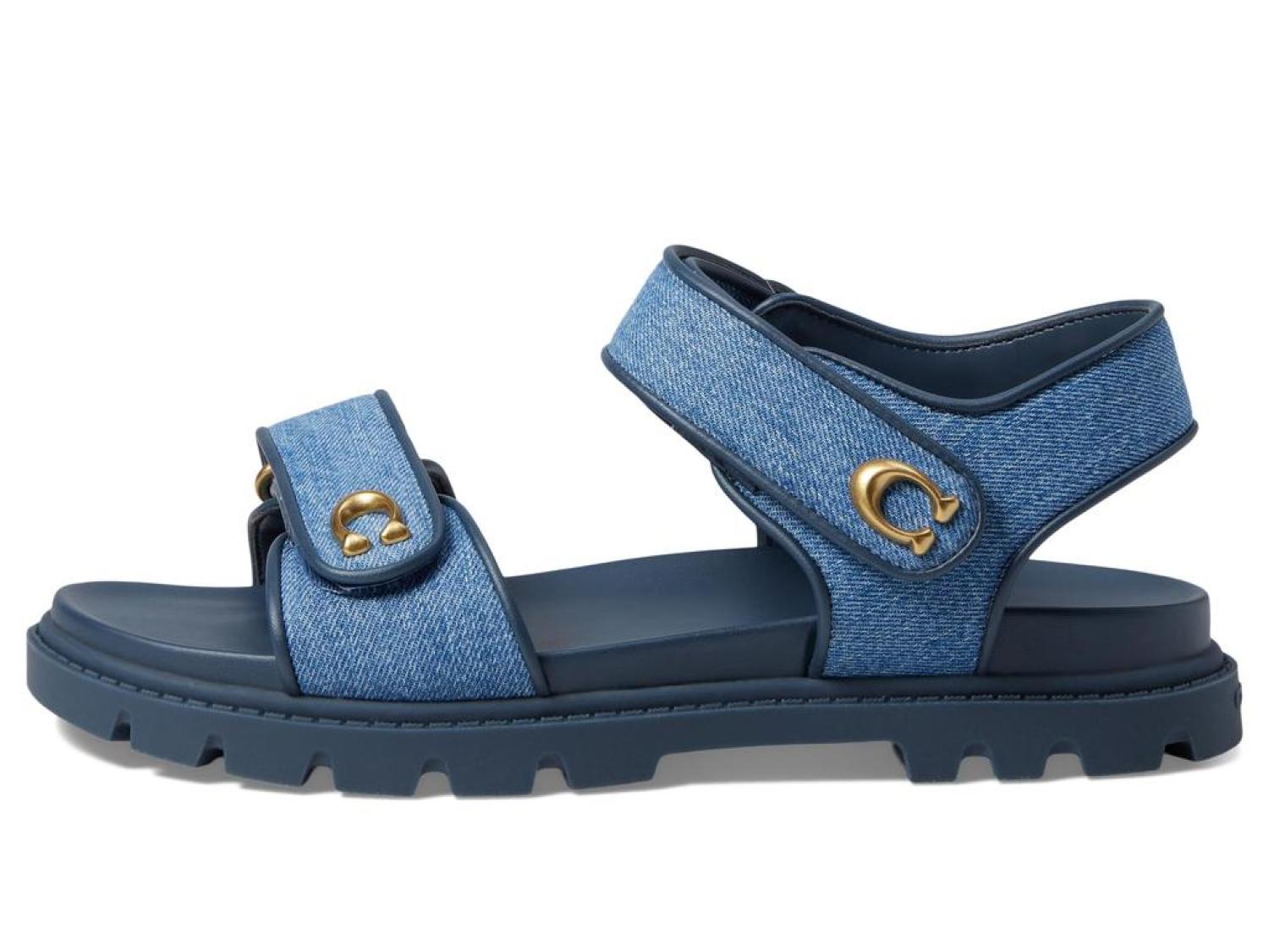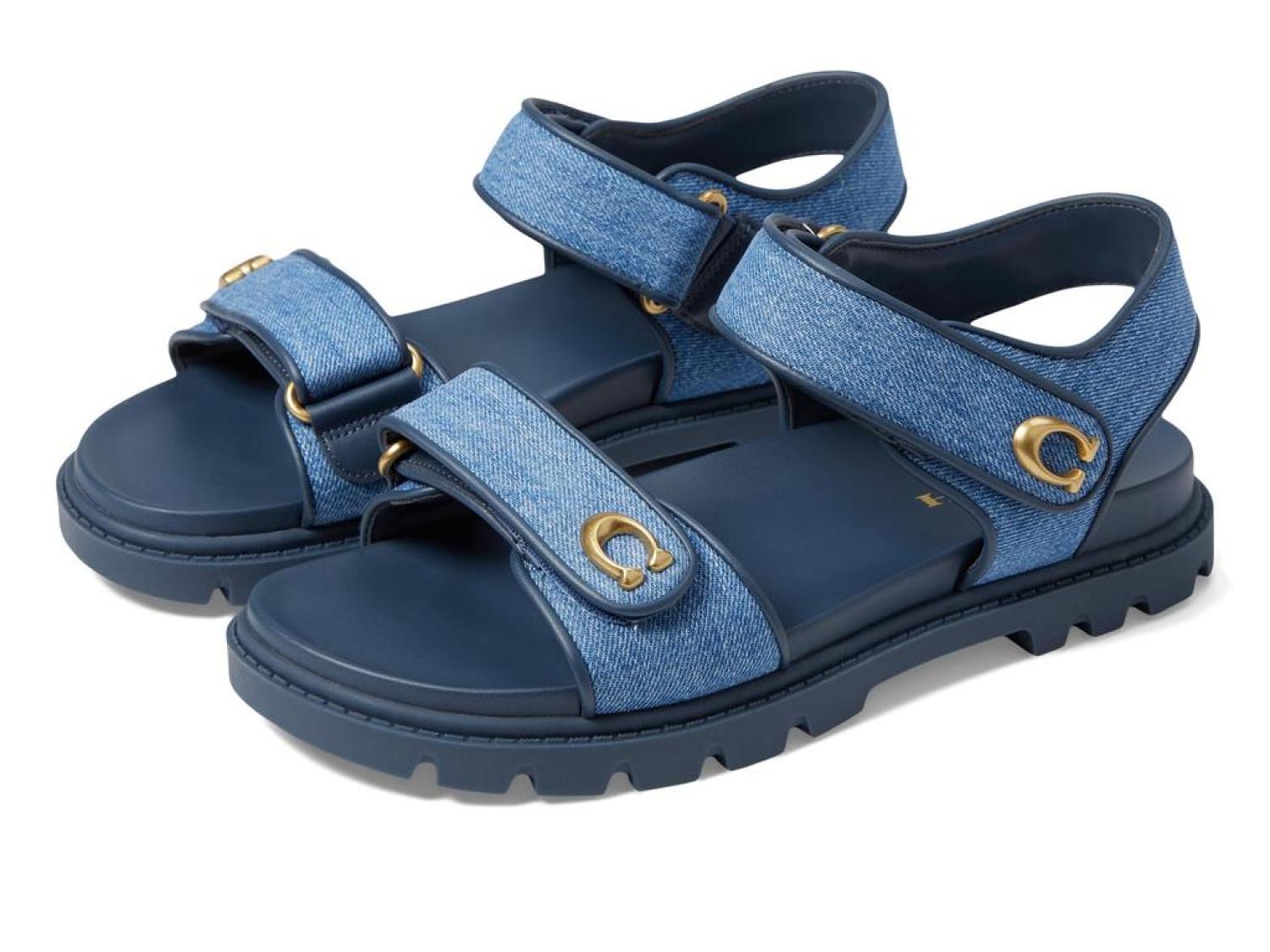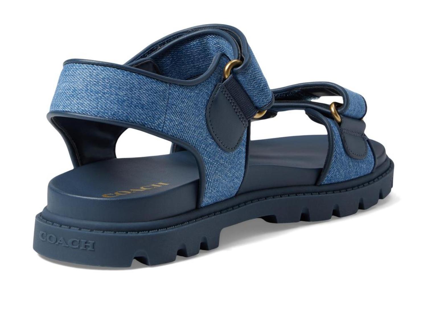 Discover the epitome of chic wearing COACH® Brynn Denim Sandal. Crafted with a denim and man-made leather upper, these sandals exude casual elegance. The man-made leather lining and footbed ensure a luxurious feel with every step, while the EVA outsole provides lightweight cushioning and flexibility. The Velcro closure offers a secure fit, and the EVA insole adds extra support for all-day wear.