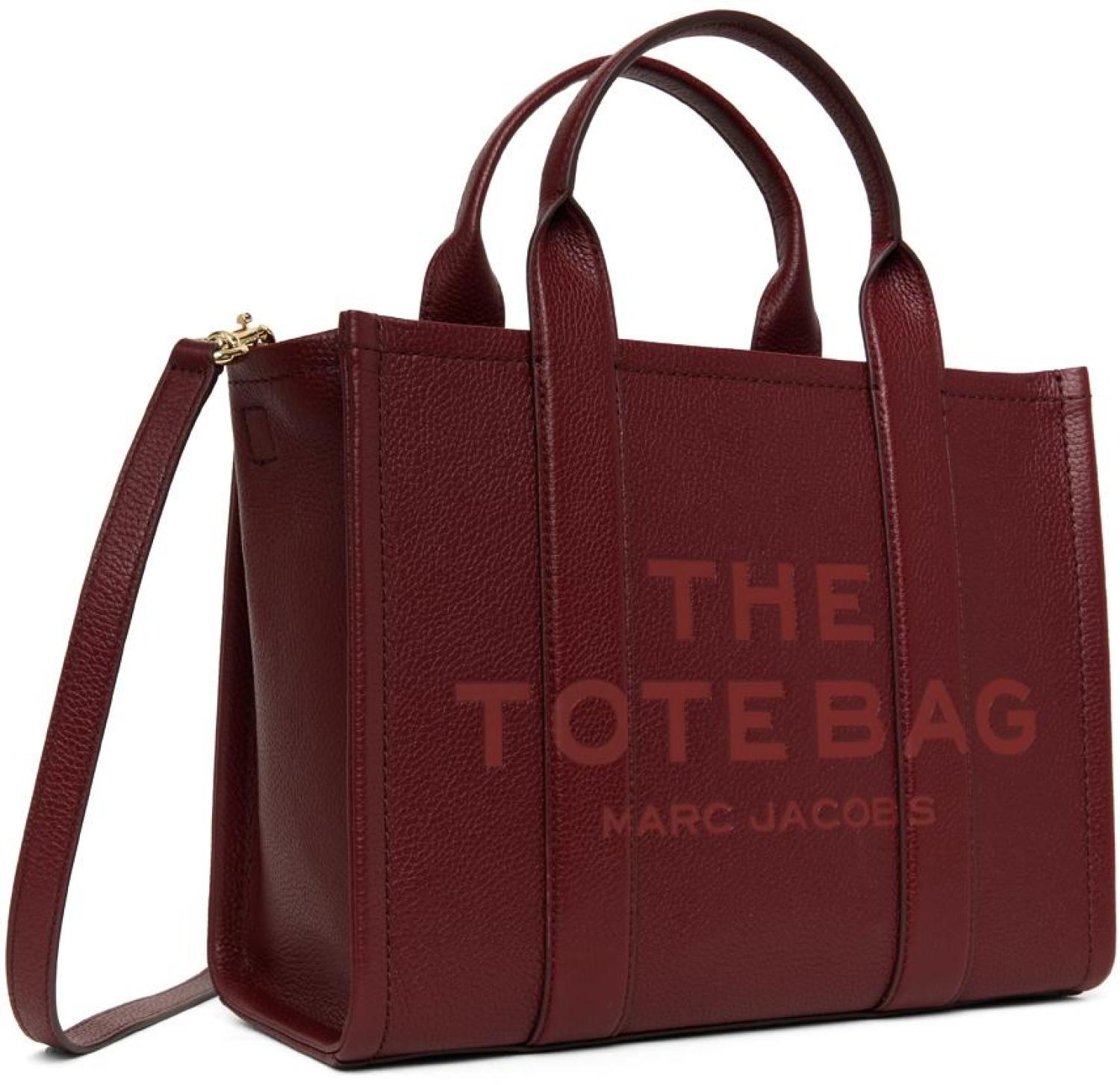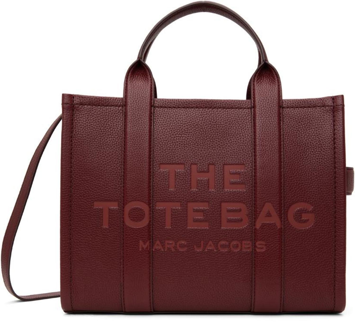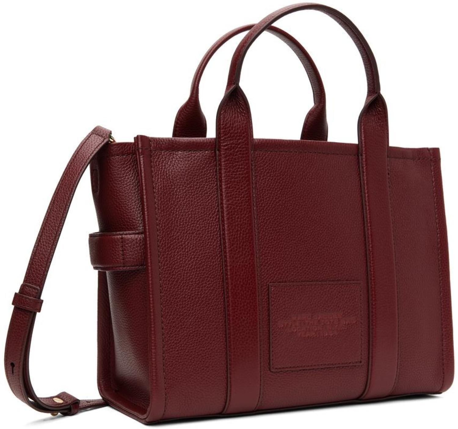 Marc Jacobs Burgundy 'The Leather Medium' Tote Pebble grained leather tote in burgundy. · Rolled carry handles · Adjustable and detachable crossbody strap · Logo embossed at face · Carry handle at side · Logo patch at back face · Leather bumper pads at base · Zip closure · Zip pocket and patch pockets at interior · Twill lining · Logo-engraved gold-tone hardware · H10.5" x W12.75" x D6" Supplier color: Cherry Leather. Made in Viet Nam. 241190F049009
