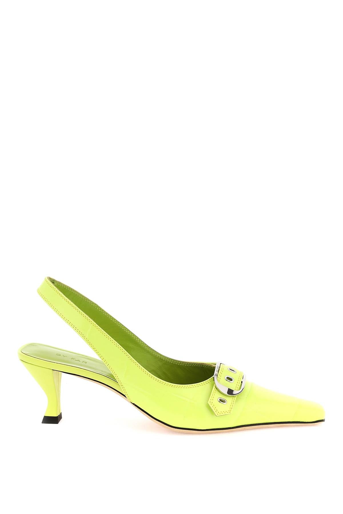 • Slingback pumps by By Far crafted in croco-embossed leather with silver metal buckle appliqué on the front. Leather footbed and leather sole. Heel Height = 6,5 cm