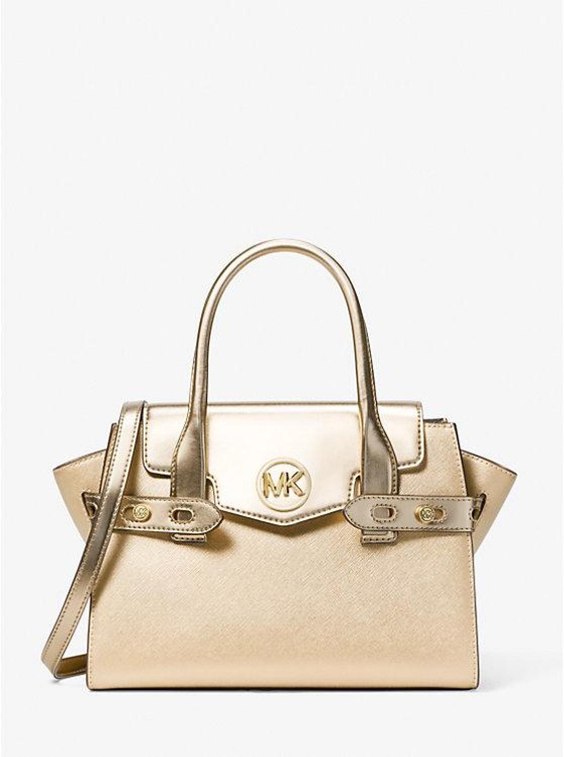 Designed in a classic trapeze shape, our Carmen satchel is equal parts refined and practical. This bag is crafted from metallic faux leather with luxe gilded hardware, and includes a detachable crossbody strap for added versatility. With a pocketed interior that makes for easy organization, it features belted side gussets that can be adjusted to alter the silhouette.