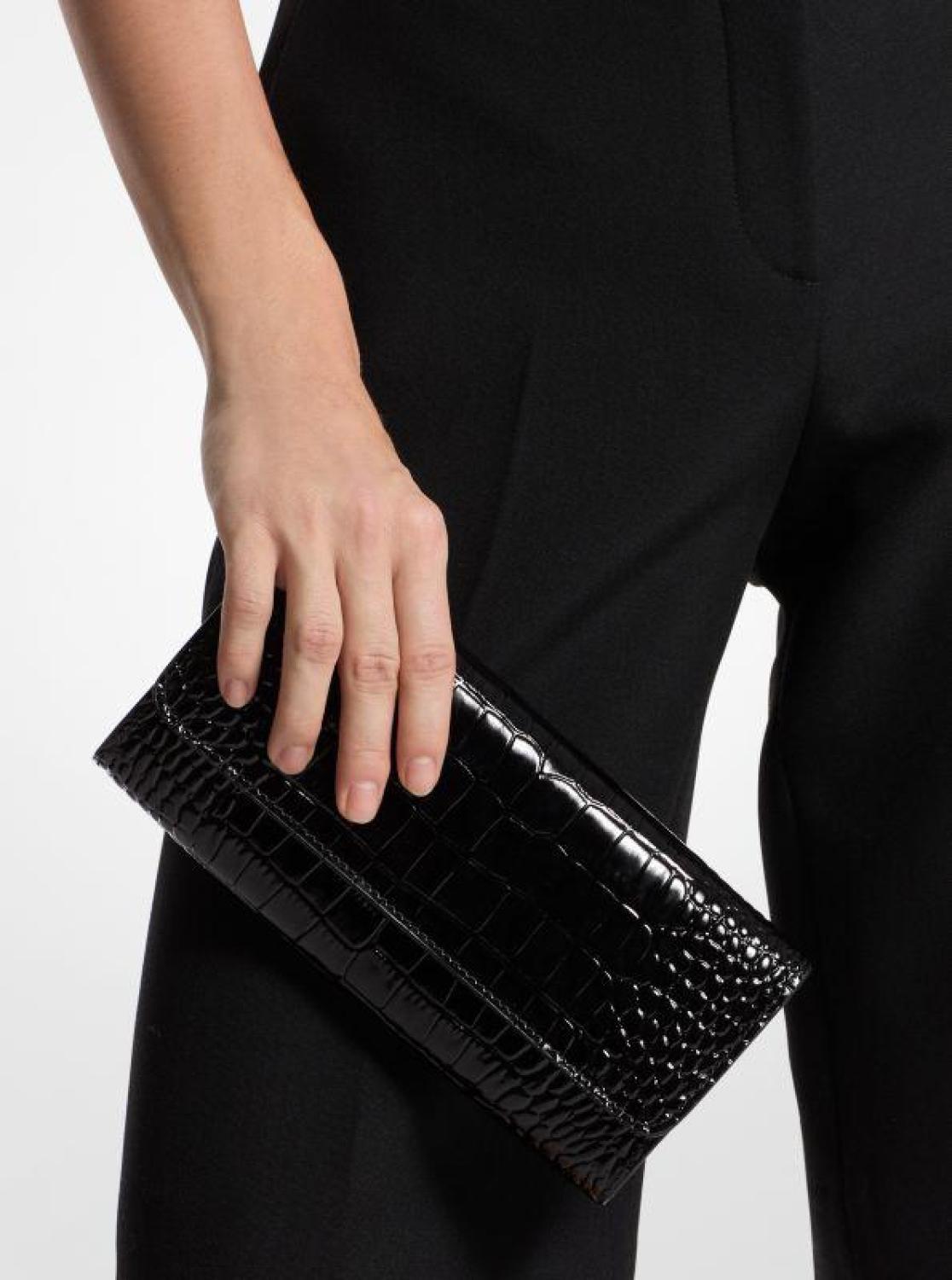 • Our Cate clutch is the epitome of elegance. Made in Italy, its structured shape is crafted from crocodile-embossed calf leather for a luxurious look and feel. Wear it as a crossbody using the detachable chain-link strap, carry it in hand, or toss it in your bag.