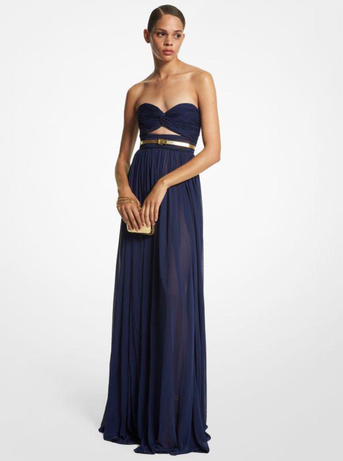 • Alluring cutouts and a barely-there skirt add punch to this daring gown. Crafted in Italy from lightweight chiffon jersey, it’s designed with a sweetheart neckline and empire waist that descends to a playful pleated. Style it with a dainty gold belt to further define the waist.