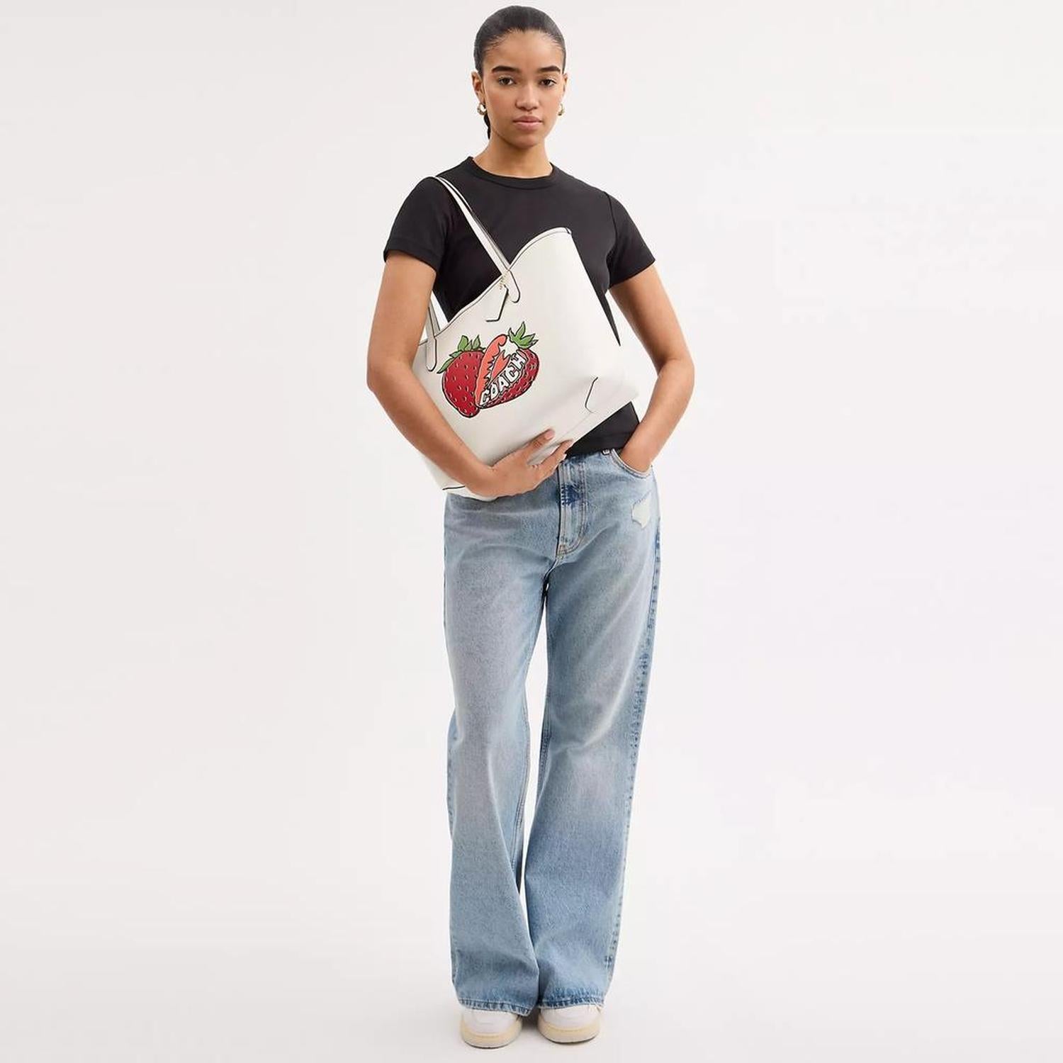 Double face pebble leather Inside zip pocket Snap closure Handles with 10 drop 13 (L) x 11 1/2 (H) x 6 1/4 (W) Style No. CAL64 | Coach Outlet City Tote Bag With Strawberry Graphic - Red