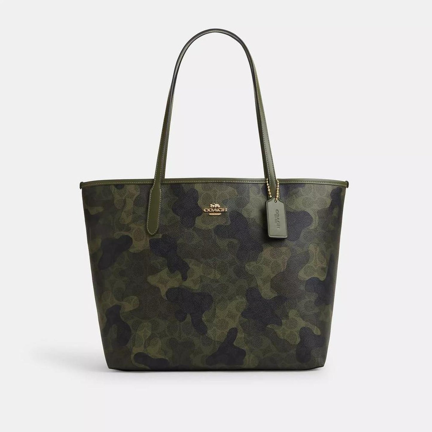• Signature coated canvas Trim partially made with recycled leather fiber layer Inside zip pocket Snap closure Handles with 10 drop 13 (L) x 11 1/2 (H) x 6 1/4 (W) Style No. CV953 | Coach Outlet City Tote Bag In Signature Camo Print - Multi