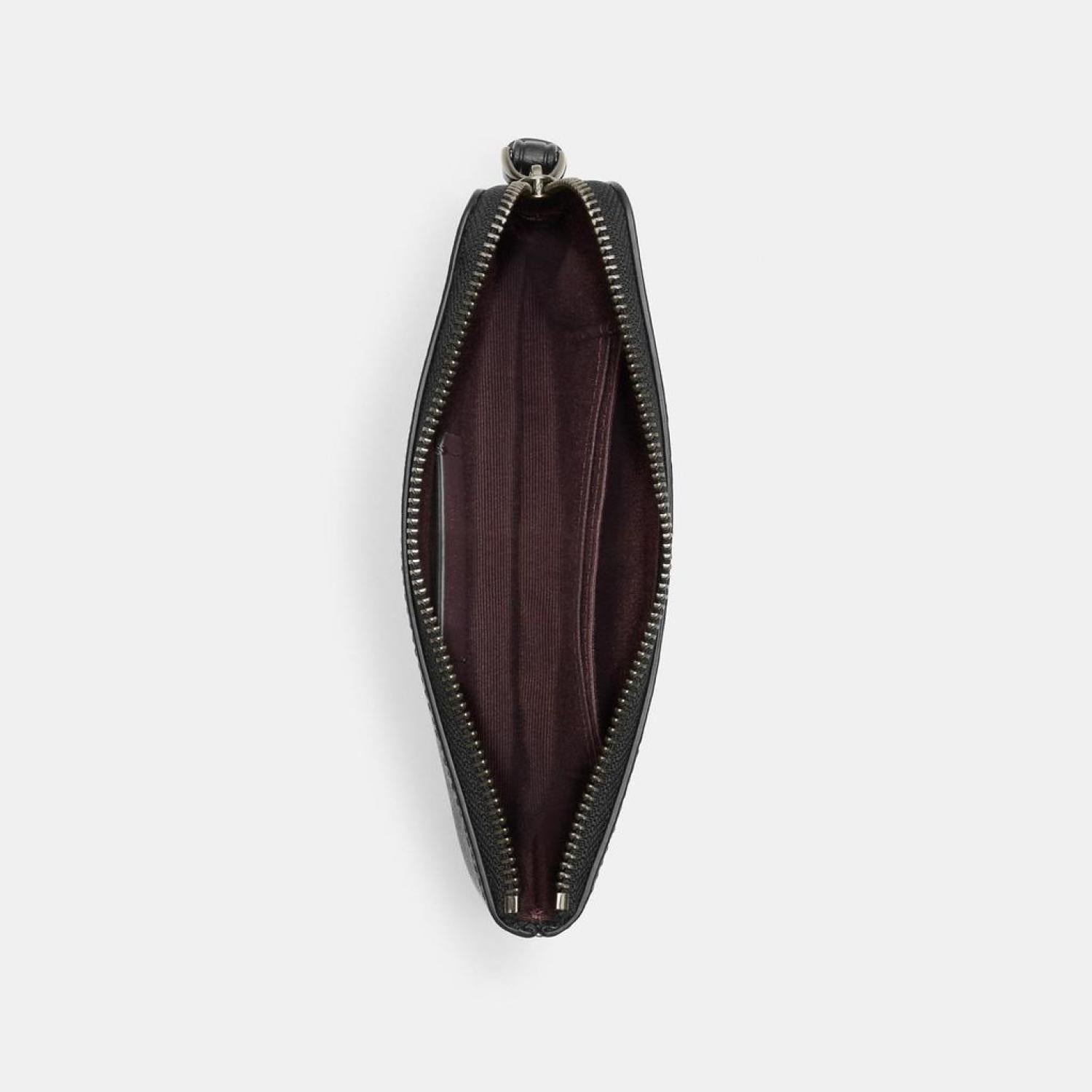 Printed coated canvas and smooth leather Two credit card slots Zip-top closure fabric lining Wrist strap attached 6 1/4 (L) x 4 (H) x 1/2 (W) Disney x Coach ©Disney Style No. CN031 | Coach Outlet Disney X Coach Corner Zip Wristlet With Holiday Print - Black