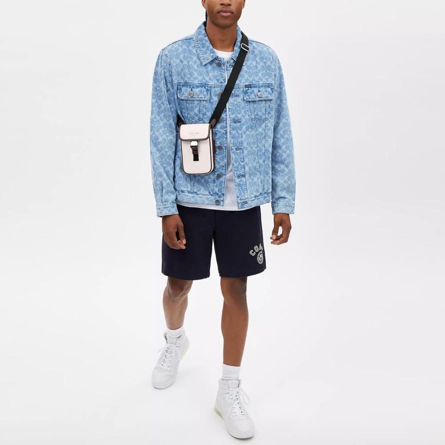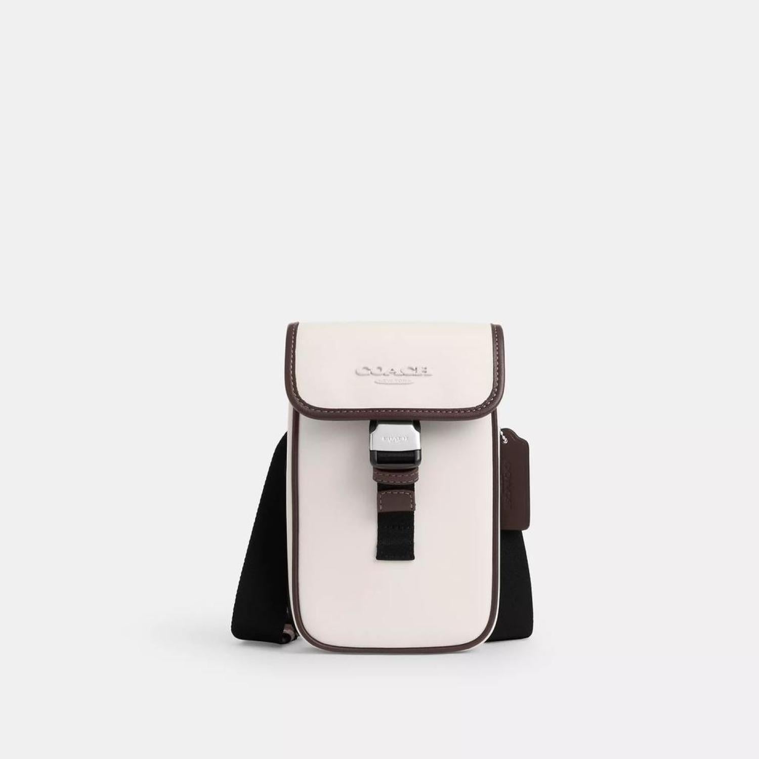• Smooth calf leather Speedclip closure fabric lining Adjustable strap with 29 1/2 drop for shoulder and crossbody wear 4 1/4 (L) x 7 1/4 (H) x 1 1/2 (W) Style No. CT887 | Coach Outlet Racer Phone Crossbody In Leather - White