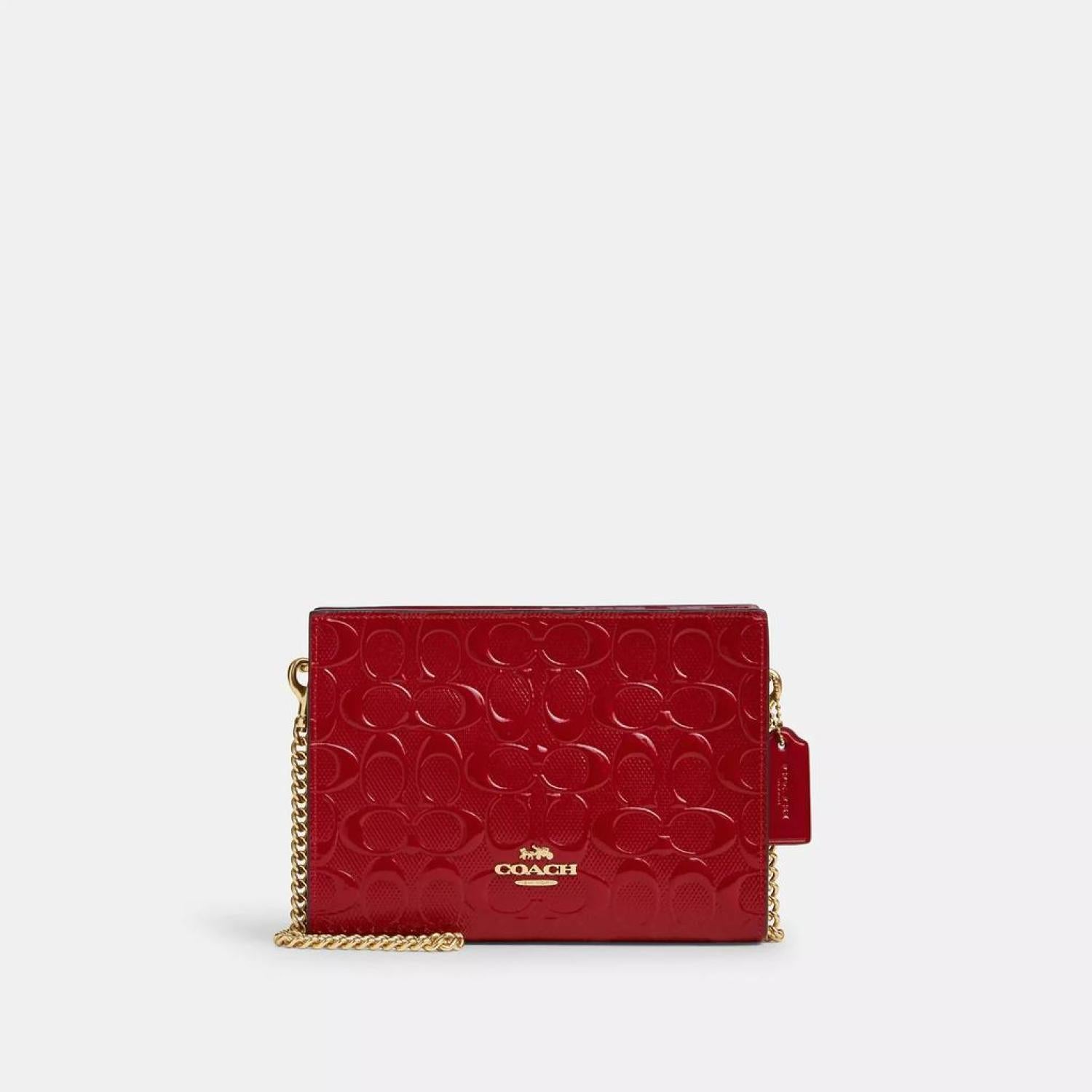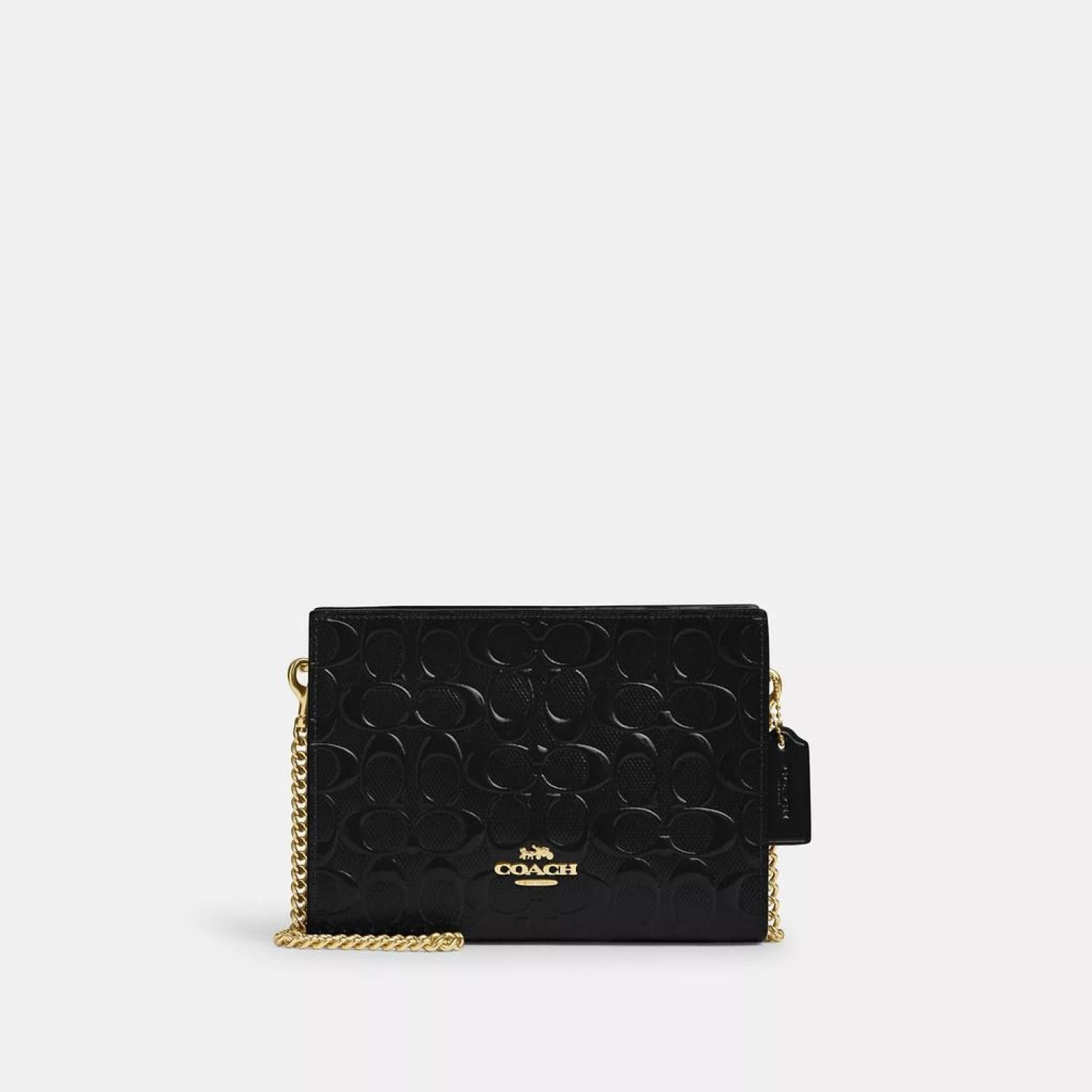 • Signature patent leather Two credit card slots Zip-top closure fabric lining Chain strap with 22 1/2 drop for shoulder or crossbody wear 7 3/4 (L) x 5 1/2 (H) x 1 1/4 (W) Style No. CV407 | Coach Outlet Slim Crossbody In Signature Leather - Black/Oy2