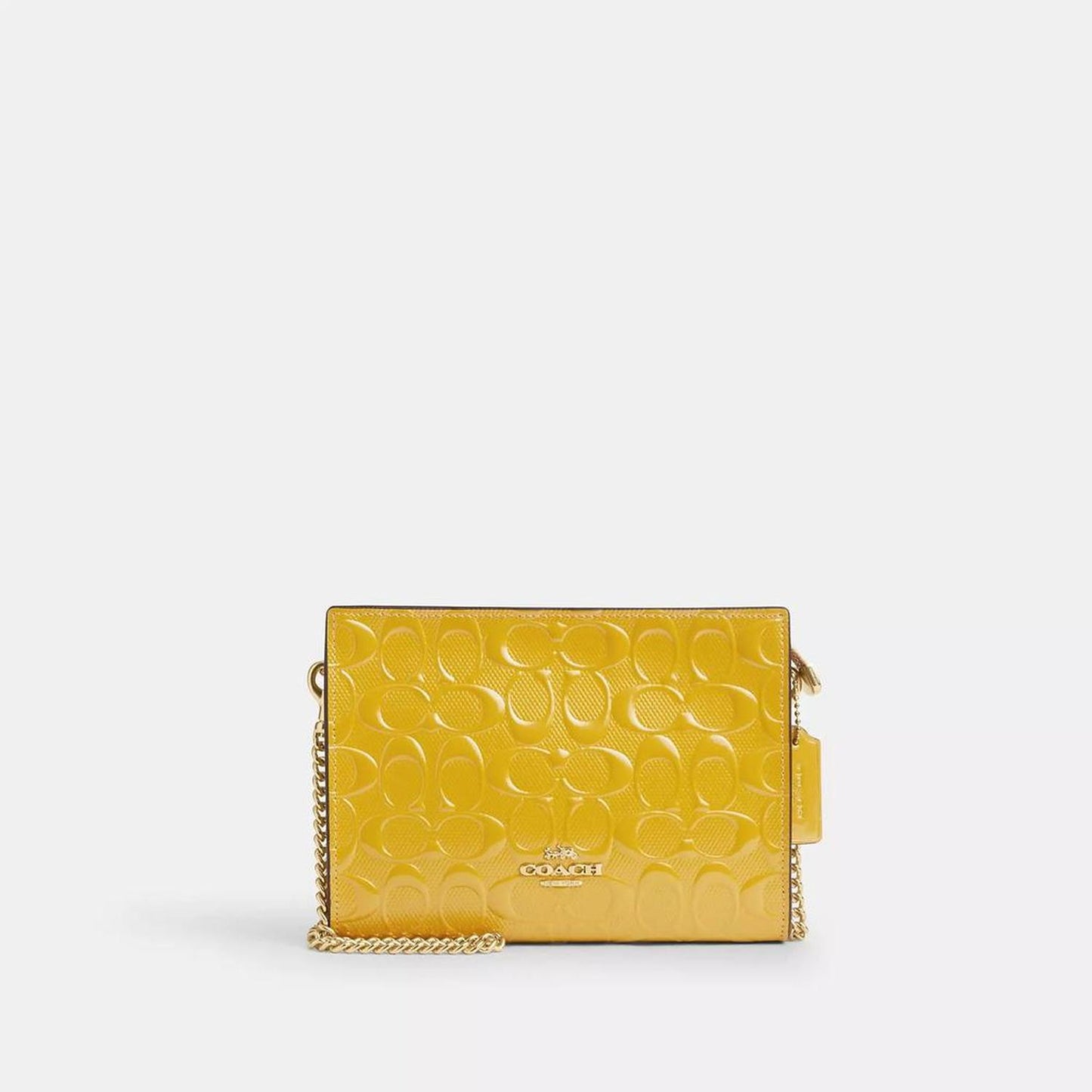 Signature patent leather Two credit card slots Zip-top closure fabric lining Chain strap with 22 1/2 drop for shoulder or crossbody wear 7 3/4 (L) x 5 1/2 (H) x 1 1/4 (W) Style No. CT869 | Coach Outlet Slim Crossbody In Signature Leather - Yellow