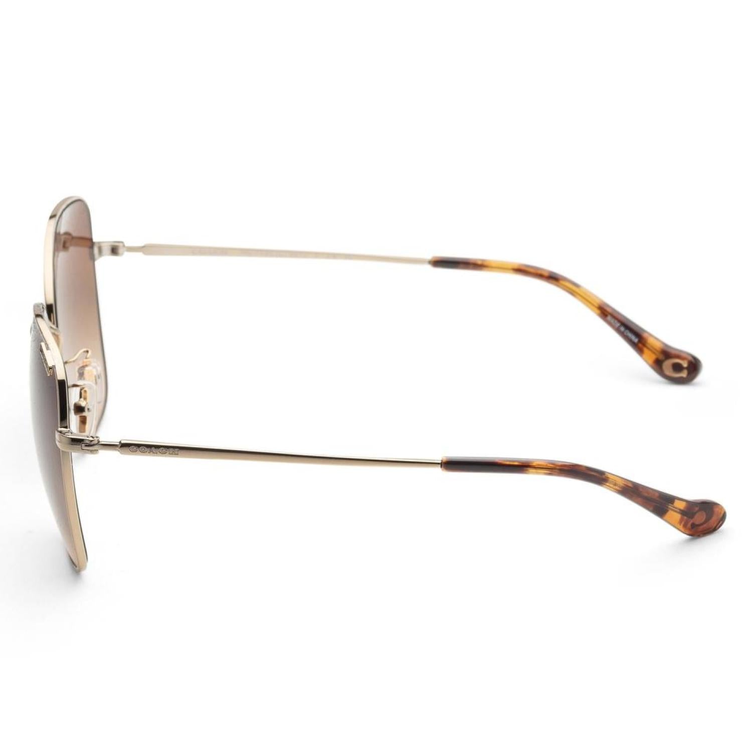 Coach Women's Sunglasses. Dimensions - 57 mm x 17 mm x 140 mm. Shiny Light Gold Square Metal frame, Dark Brown Gradient lenses. 100% UV Protection, Non-Polarized. Made in China. (HC7133-900574-57)
