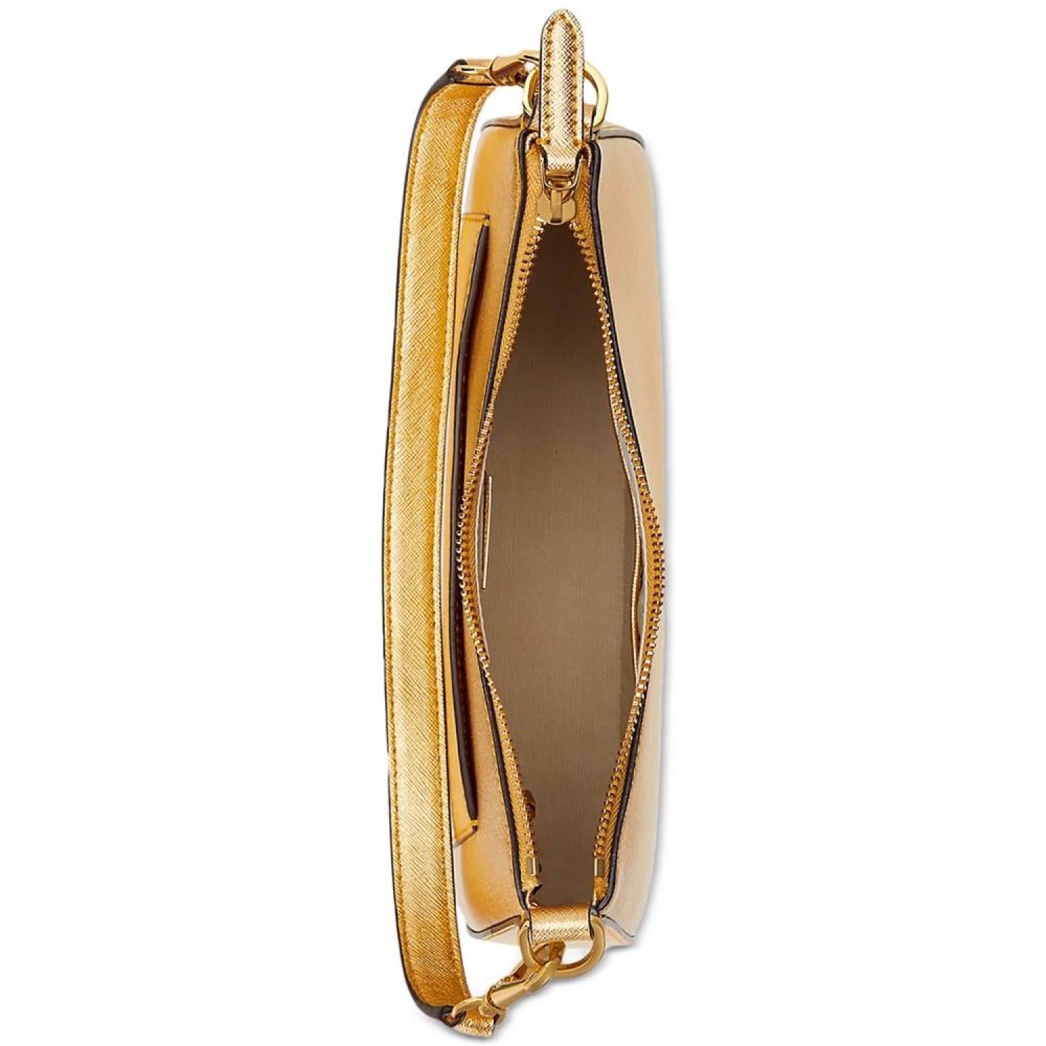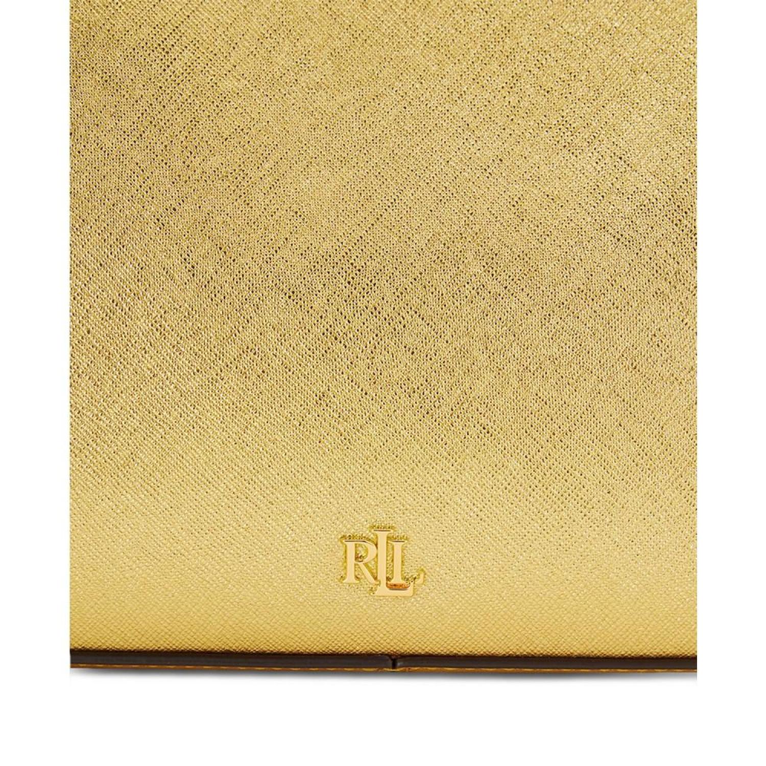 With its curved silhouette and luxurious crosshatch leather, the Danni Shoulder Bag by Ralph Lauren is a sophisticated accessory that you'll reach for again and again. Small sized bag; 10"W x 7-1/2"H x 2"D (width is measured across the bottom of the bag); 0.98 lbs. approx. weight Silhouette is based off 5'9" model 8-3/4"L handle; 21-1/4"L removable, adjustable strap Zip-top closure Gold-tone hardware & exterior slip pocket Interior zip & slip pockets Dust bag included Leather; lining: polyester Professional leather clean Imported