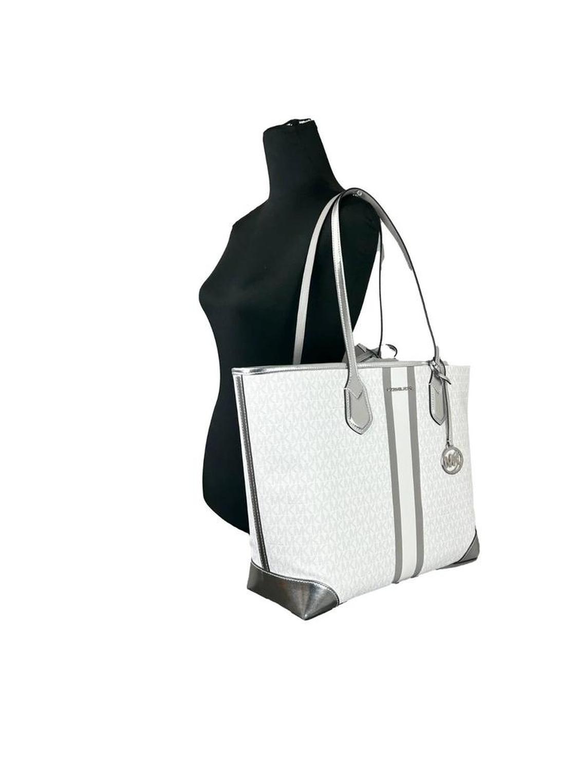 Style - Michael Kors Eva Large Tote with Pouch (Optic White)Material - Leather / PVCFeatures - Removable Pouch, Center Stripe, Double Handles, MK CharmMeasures - 43.81 cm L x 32.38 cm H x 13.97 cm D Size - One Size