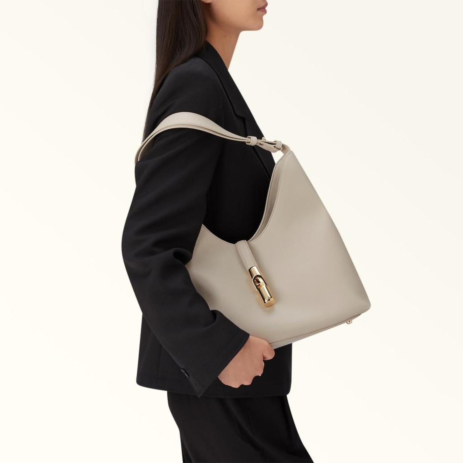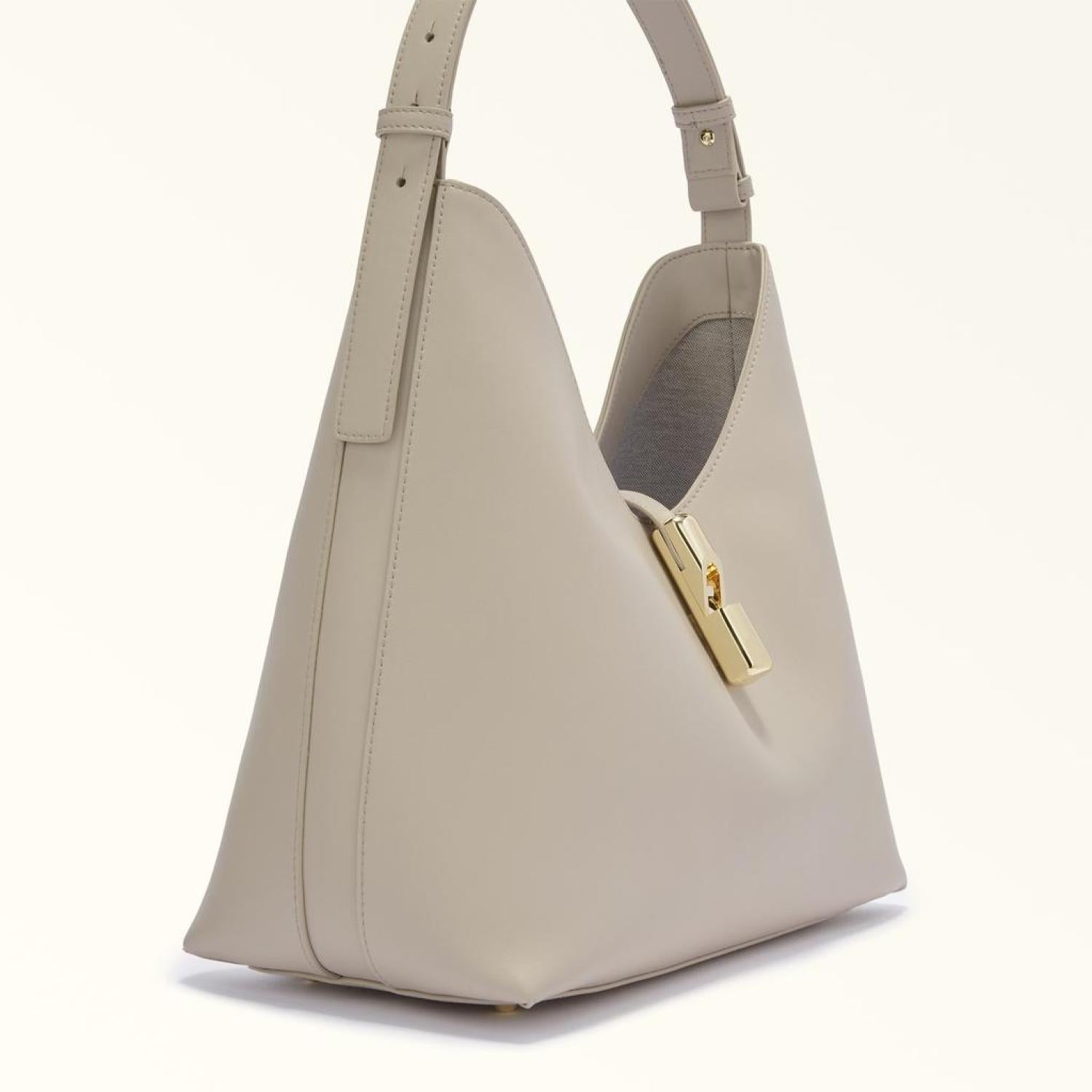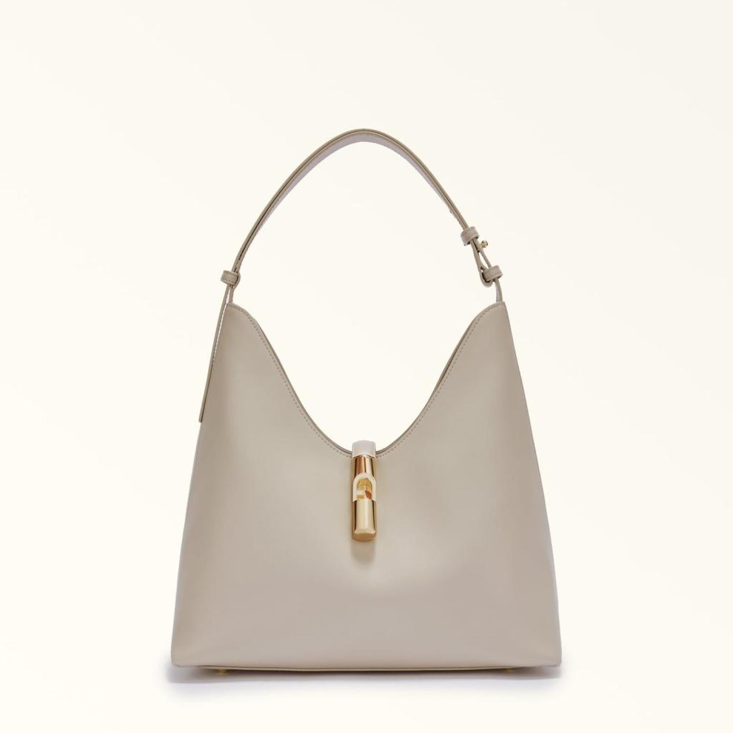 • The soft silhouette and relaxed structure of this Furla Goccia hobo bag gives it a sleek and contemporary accent. Styled in silky smooth leather with a rich feel, it is roomy enough inside to hold all your essentials. The new cylindrical hardware reminiscent of a weight, decorated with the iconic Furla Arch logo, adds a distinctive finishing touch on the matching strap.