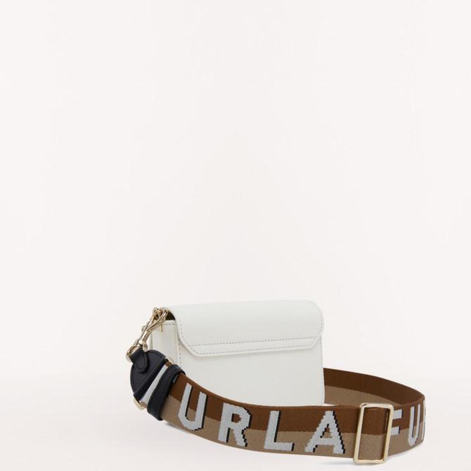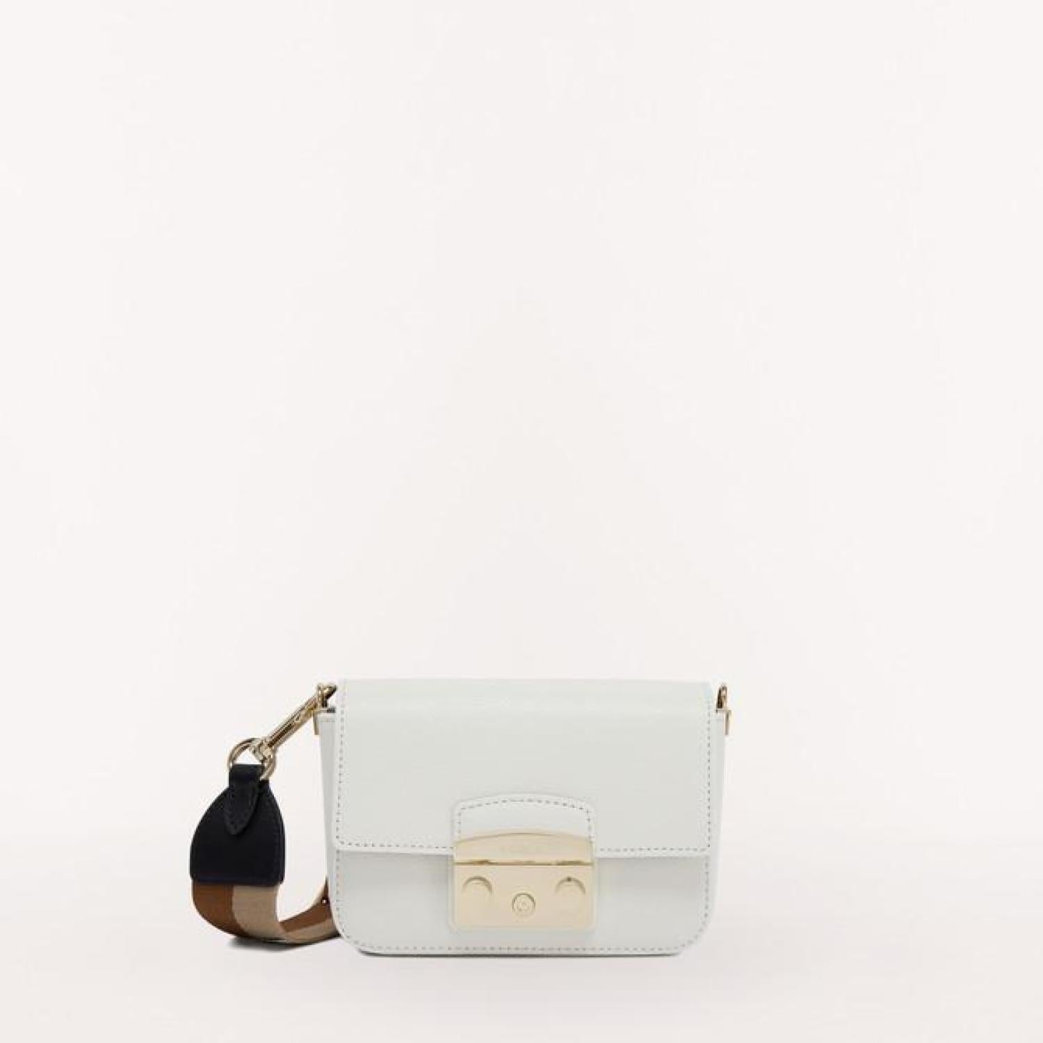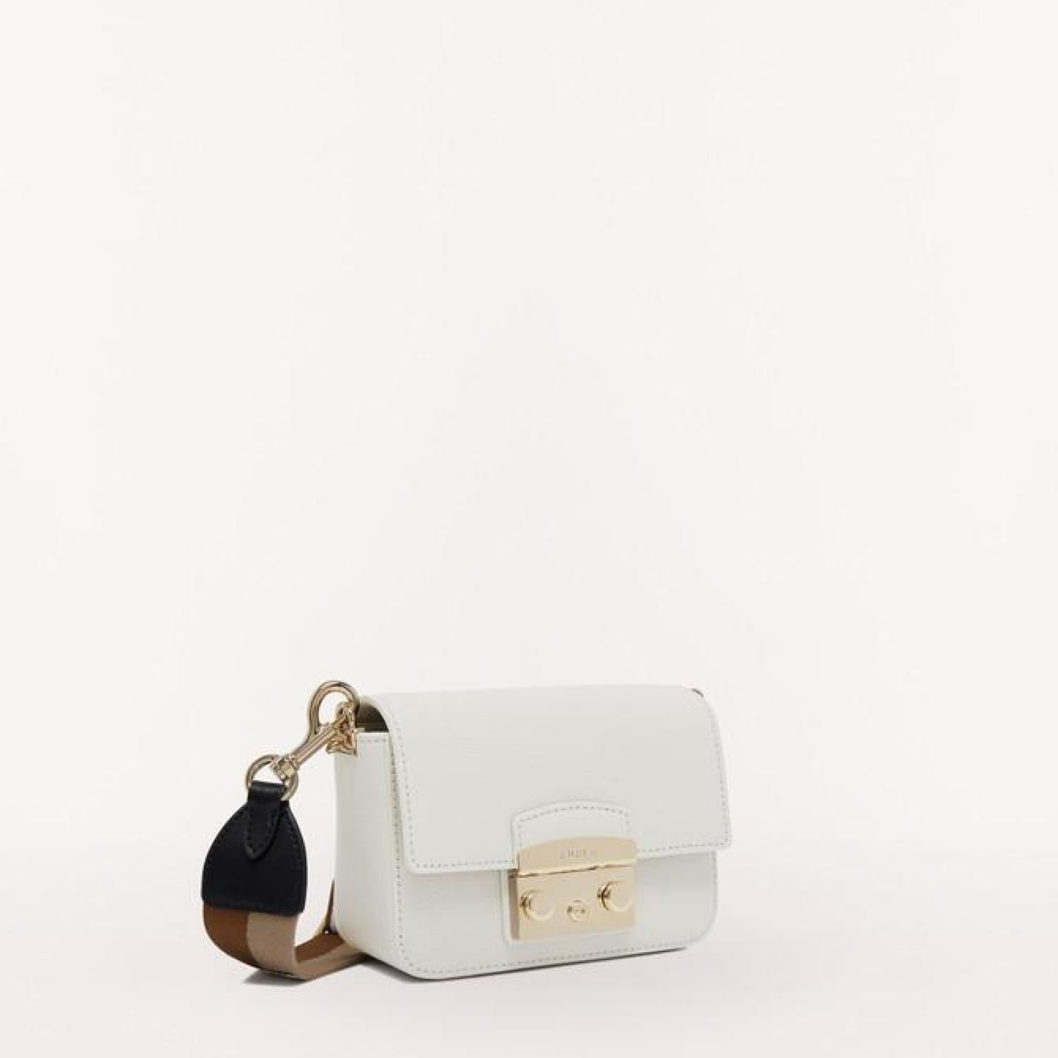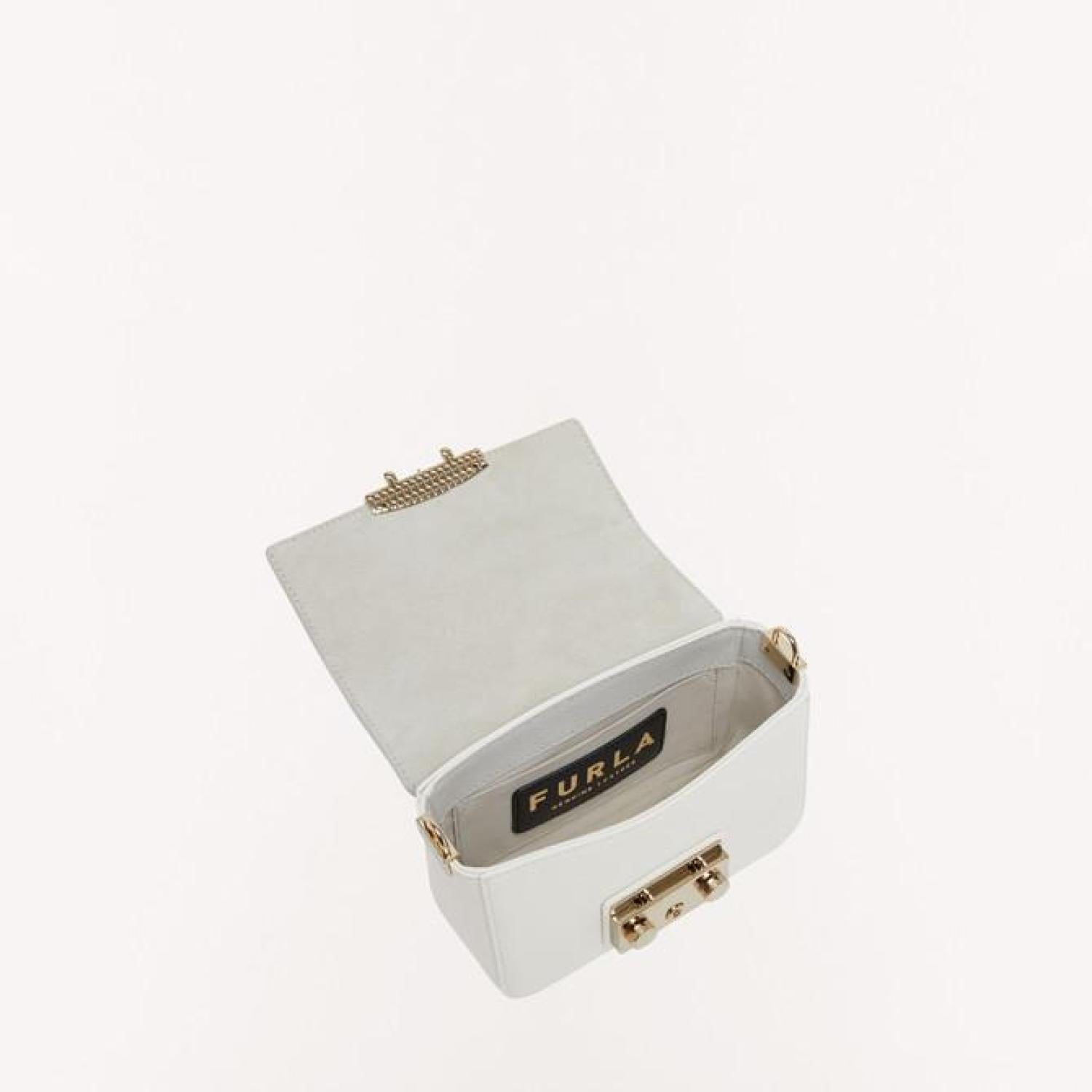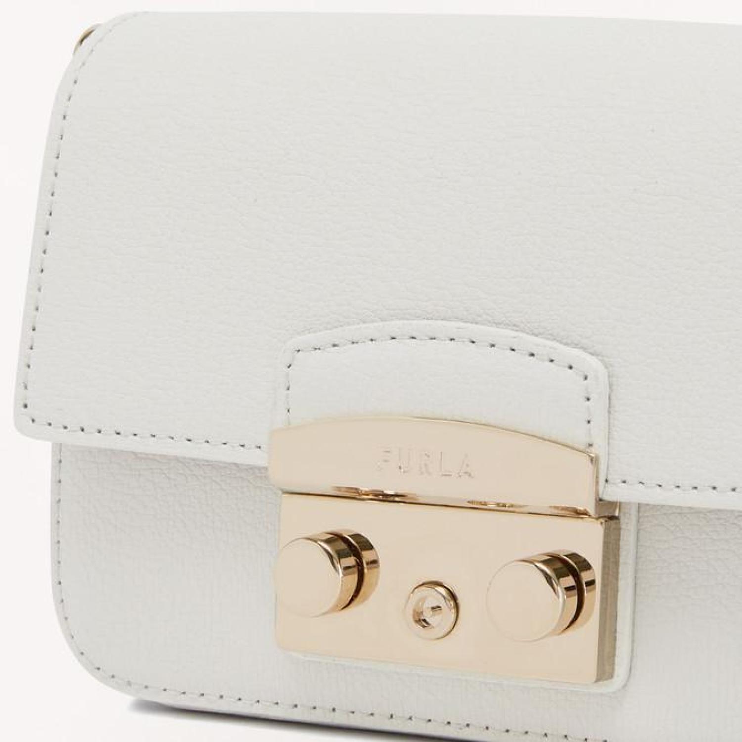 • Furla Metropolis is a mini crossbody bag made of Milos calfskin. Featuring an adjustable and removable strap made of branded webbing fabric, it can be worn on the shoulder. The small open inside slip pocket allows you to store small items and personal belongings.