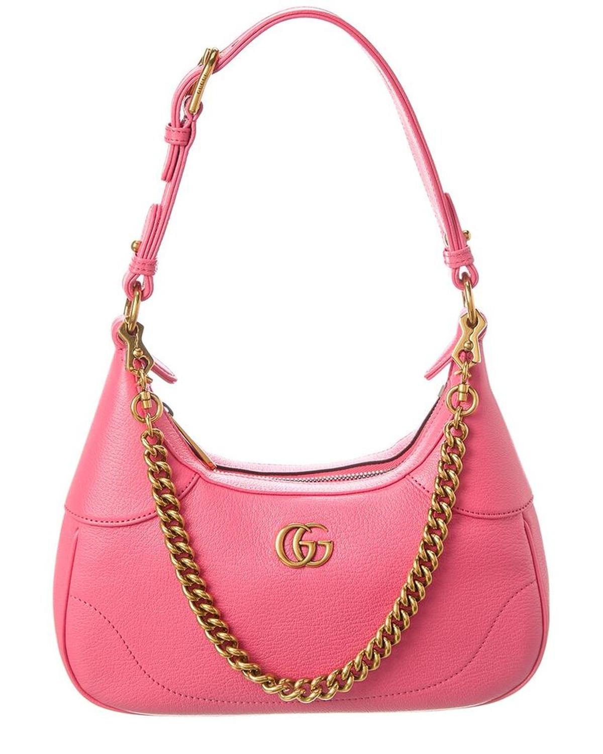 Elevate your style with the Gucci Aphrodite Small Leather Hobo Bag. This luxurious piece is crafted in Italy, showcasing the brand's eclectic and coveted design aesthetic. The pink leather bag features light fine gold hardware with an interlocking G logo accent, exuding Italian luxury redefined. Perfect for everyday use, the hobo bag has a fabric lining and interior design details that add functionality to its chic look. Measuring 9.9 inches wide, 7.5 inches high, and 2.8 inches deep, this bag offers ample space for your essentials. Carry it with the top handle for a sophisticated touch or switch to the adjustable and removable shoulder strap for added convenience. The zipper closure ensures your belongings stay secure while on the go. Please note that all measurements were taken by hand and are approximate, with slight variations that may occur. Rest assured that our products are 100% genuine, sourced from trusted independent suppliers to guarantee authenticity. Add a touch of luxury to your wardrobe with the Gucci Aphrodite Small Leather Hobo Bag.