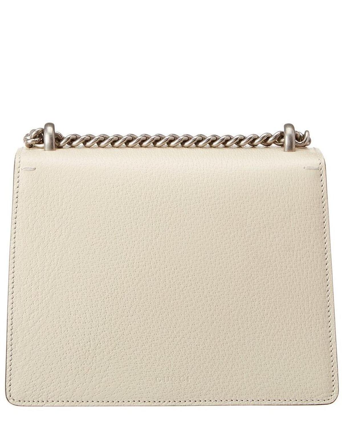 Elevate your style with the luxurious Gucci Dionysus Mini Leather Shoulder Bag. This exquisite piece is crafted in Italy from beautiful white leather, featuring dark silver hardware and crystal accents for a touch of glamour. The interior is lined with canvas, providing a durable and chic finishing touch. Measuring 8 inches wide, 6 inches high, and 2.5 inches deep, this mini bag is perfectly sized for your essentials. Carry it by the top handles with a 13-inch drop, or use the 24-inch shoulder strap for a hands-free option. The fold-over flap with pushlock closure adds a sophisticated detail to this must-have accessory. Please note that all measurements are approximate. Rest assured that this Gucci shoulder bag is 100% genuine, sourced from trusted suppliers to ensure authenticity. Elevate your outfit with this timeless and iconic piece from Gucci.