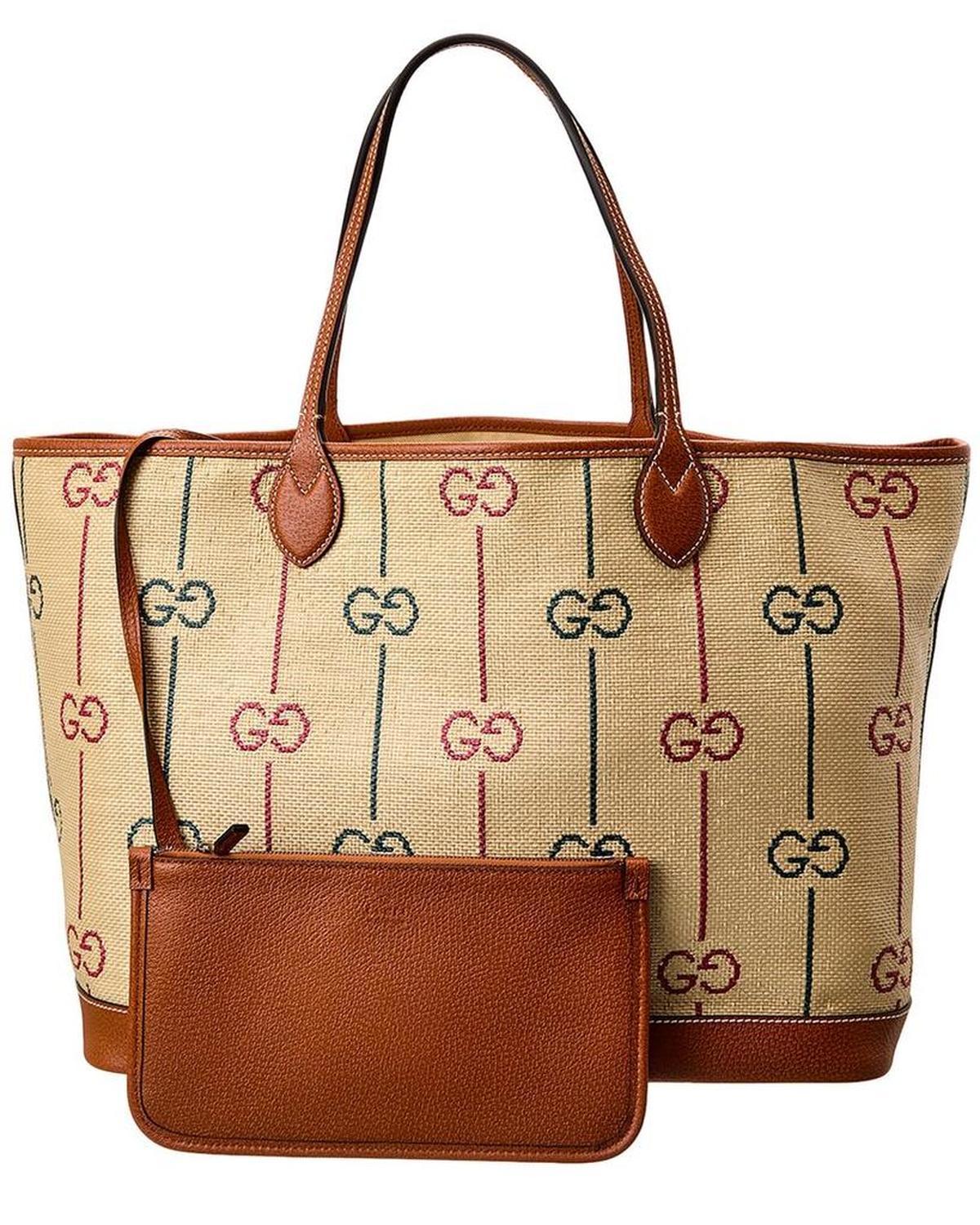 Introducing the Gucci Ophidia Large GG Canvas & Leather Tote, a luxurious addition to your handbag collection. Crafted in Italy, this tote features the iconic brown GG woven canvas and brown leather, accented with light fine gold hardware for a sophisticated touch. The interior is lined with canvas and includes a zippered pouch for added organization. Measuring 15.7 inches wide, 13 inches high, and 7.5 inches deep, this tote is spacious enough for all your daily essentials. The shoulder straps have an 8-inch drop, making it comfortable to carry on your shoulder. Please note that all measurements are approximate and may vary slightly. Rest assured, our products are 100% genuine, sourced from trusted suppliers to guarantee authenticity. Elevate your look with this timeless and elegant Gucci tote.