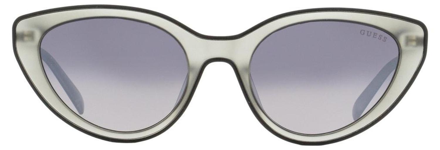 The Guess 3061 Sunglasses feature a fresh cat-eye shape for women. The transparent plastic frame features a dark rimmed detail on the front and metal branding on the temples. Guess sunglasses are fresh, youthful and fashion-forward. Guess eye-wear reflect the brand essence with easy to wear frames that are versatile yet a unique expression of self. Providing 100% UV protection from the suns harmful rays these sunglasses are functional in addition to being fashionable. Frame Material - Plastic (Acetate) Frame Color - Frosted Transparent Gray Lens Color - Gray Gradient Size - 54-20-145 Made in China Includes original case and cloth