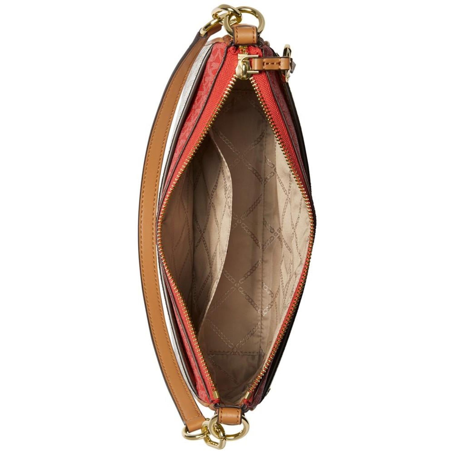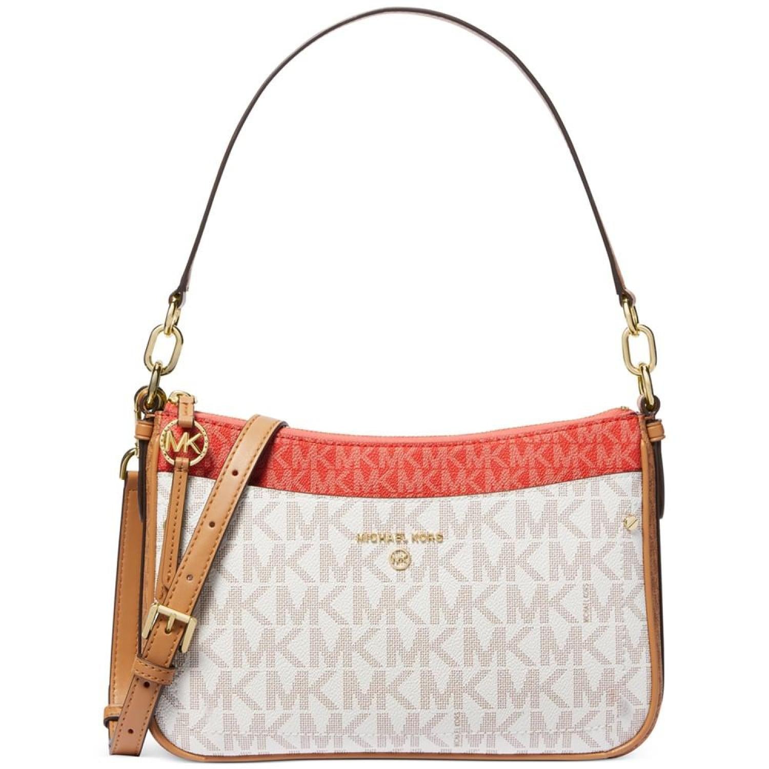 Pops of color with classic monogram define this crossbody by MICHAEL Michael Kors. Featuring pockets inside and out, styling is versatile with the removable strap. Small sized bag; 10-3/4"W x 7-1/4"H x 2-1/4"D (width is measured across the bottom of handbag) Silhouette is based off 5'9" model 5"L handle; 24"L strap Zippered closure Gold or silver tone hardware ,varies by style Interior slip pocket & 6 card slots exterior back slip pocket & polished metal logo & charm PVC, polyester, polyurethane; lining: polyester Spot clean Imported