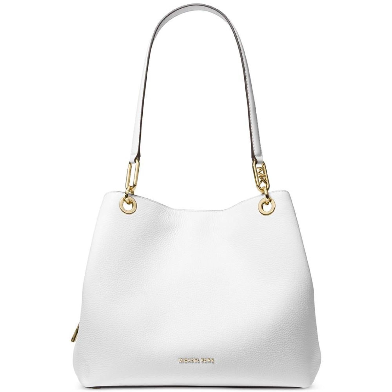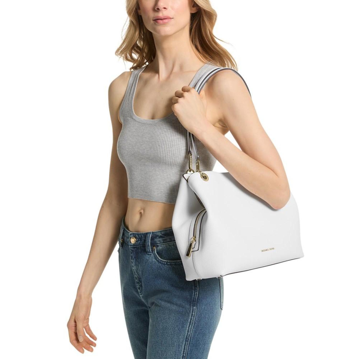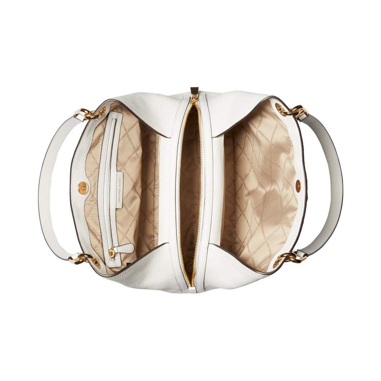 Incredibly functional with multiple interior compartments, the Kensington Medium Leather Tote by MICHAEL Michael Kors lends sophistication to organization. Medium sized bag; 12-1/2"W x 10-1/4"H x 5-1/2"D (width is measured across the bottom of handbag); 1.74 lbs. approx. weight Silhouette is based off 5'9" model 10-1/2"L handles Snap closure Gold-tone hardware & exterior back zip pocket Interior center zip compartment, zip pocket & slip pockets Leather; lining: polyester Spot clean Imported