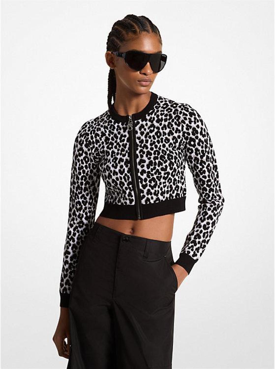 • Black, white and chic all over: this cool take on the cropped jacket features a round neckline, cropped silhouette and leopard print. Team it with slouchy trousers and wraparound sunglasses for a weekend about town.
