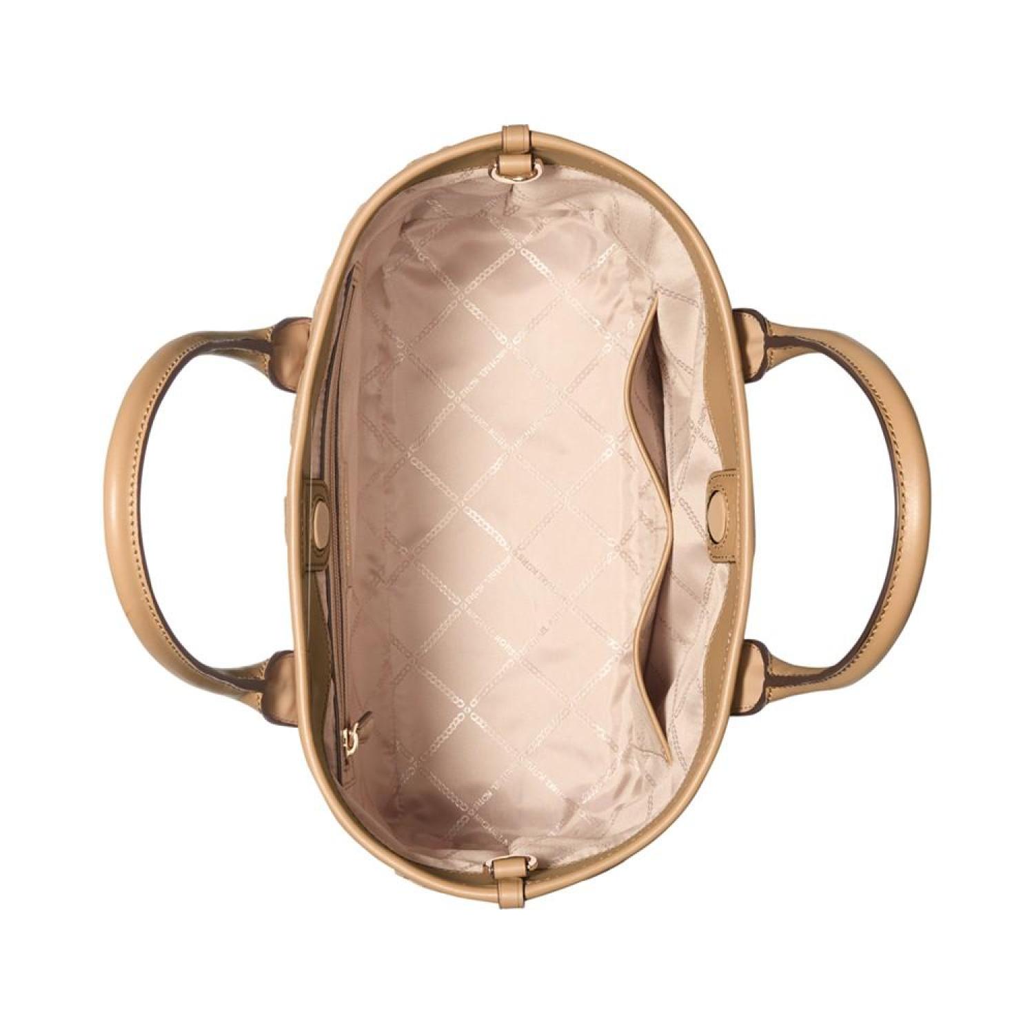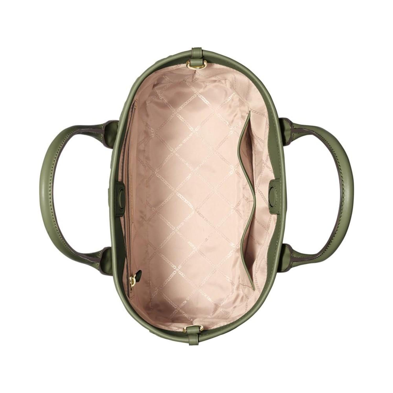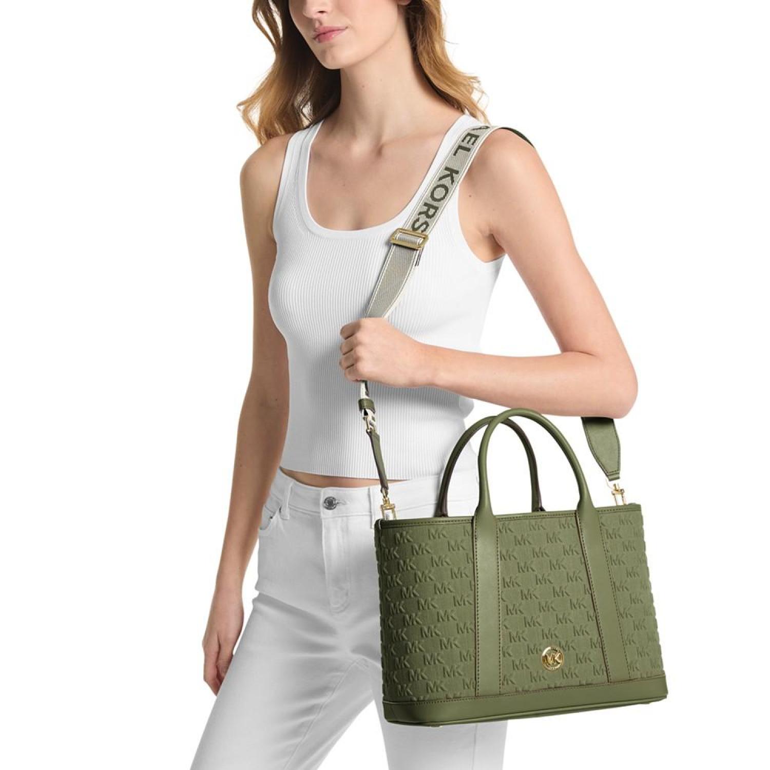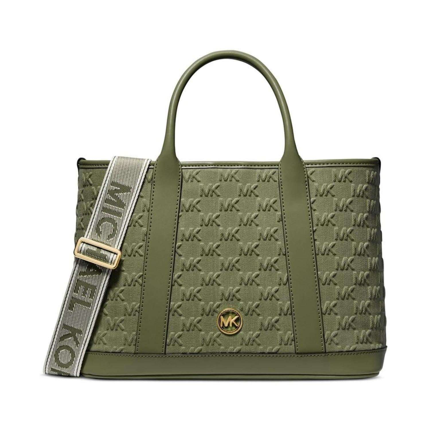 Chic and classic with a sporty webbing strap, this tote by MICHAEL Michael Kors is perfectly sized and adorned with allover embossed monogram. Medium sized bag; 14-1/2"W x 9-1/4"H x 5-1/2"D (width is measured across the bottom of handbag); 1.63 lbs. approx. weight Silhouette is based off 5'9" model 4-1/2"L handles; 25"L adjustable, removable strap Magnetic closure Gold-tone hardware & logo, interior zip & slip pockets Cotton; lining: polyester; trim: polyester, nylon; trim 2: polyurethane, cotton, polyester Spot clean Imported