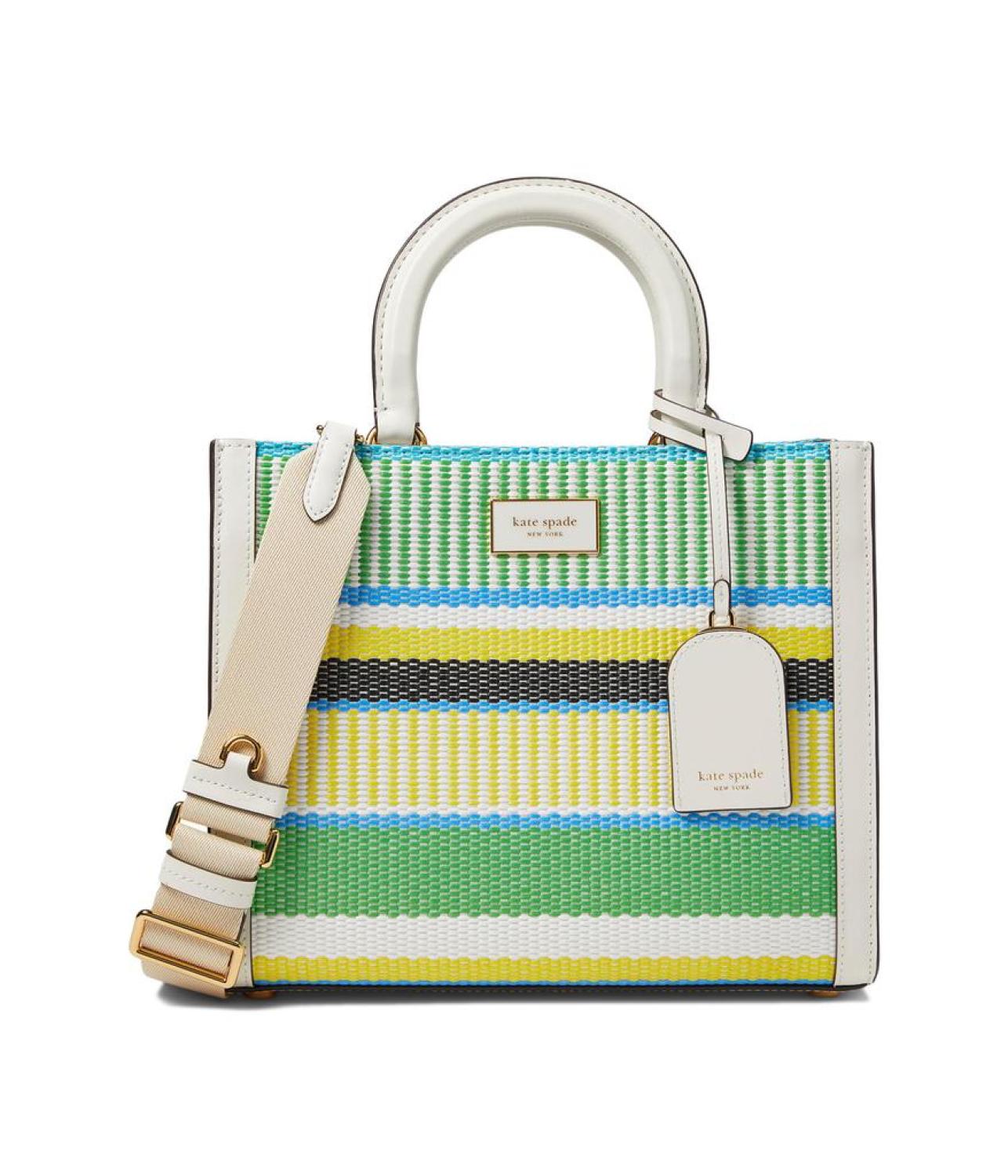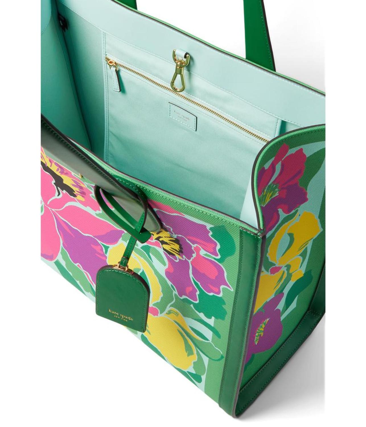 Dress with purpose carrying the Kate Spade New York® Manhattan Tropical Foliage Canvas Jacquard Small Tote. Crafted from leather, this bag features open top silhouette, dog-clip closure, two top carry handles and one detachable/adjustable crossbody strap. This bag has smooth leather trim, pinmount logo on the front, one zippered interior pocket and one interior snap pocket. Polyester lining. Imported. Please note, the hardware color and interior lining may differ from the color shown in the photo.