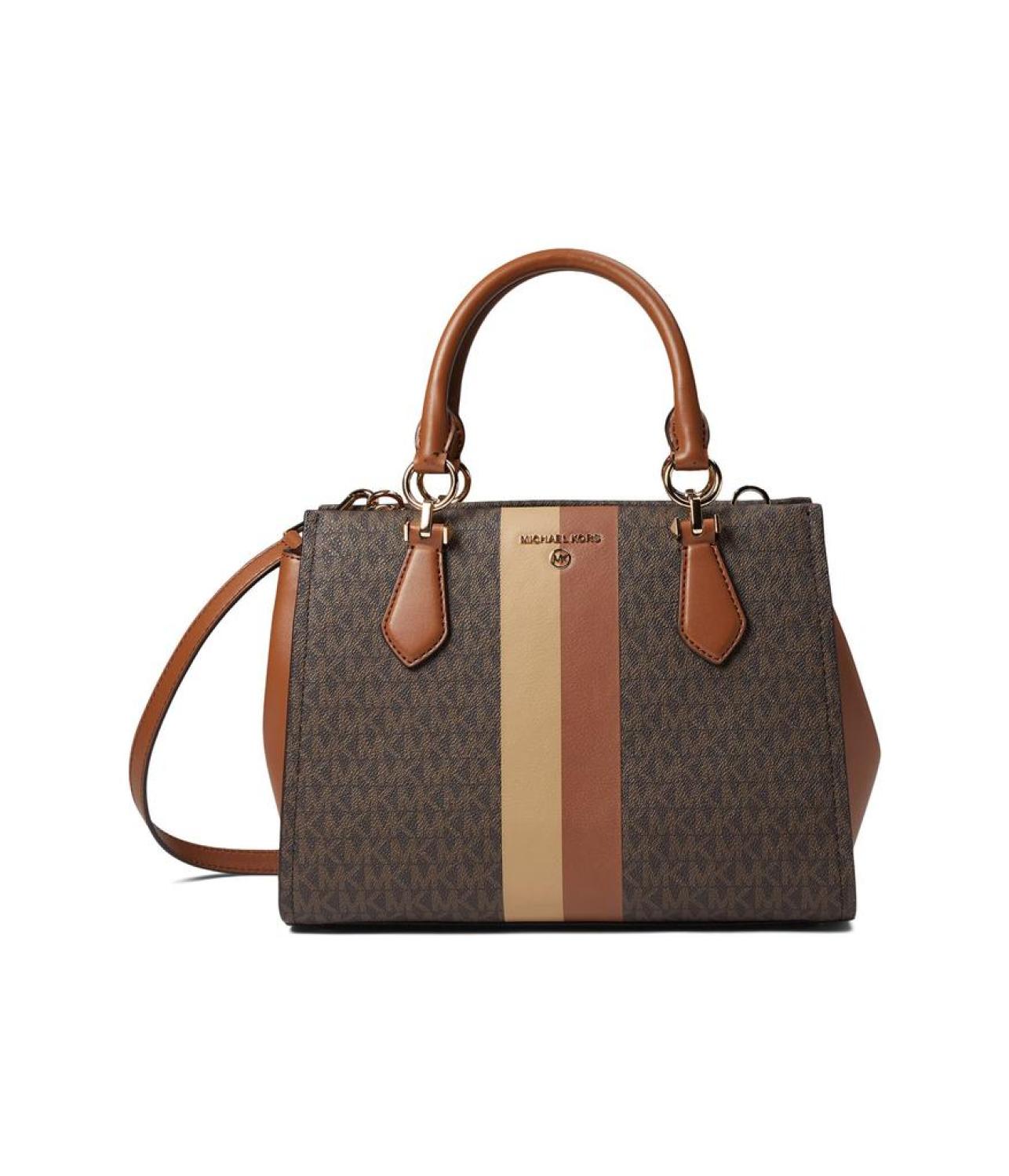 • Look absolutely stylish while carrying your belongings in a convenient and comfortable manner in the MICHAEL Michael Kors® Marilyn Medium Satchel. Framed in a structured and spacious form with a monogram-embossed exterior with a printed striped pattern on the center, the bag features zippered top closure that reveals one interior back wall zippered pocket and two front wall slip pockets. With the two exterior front and back slip compartments, you get some additional storage.